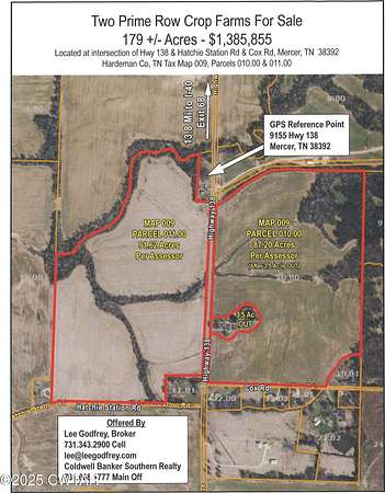 Est $9,596/moYour opportunity to own two prime row crop farms in Hardeman Co, 13.8 miles of I-40. Tax Maps 009, Parcels 010.00 & 11.00 lying on either side of Hwy 138. Approximately 148 ACRES IN ROW CROP, balance in woods and nonproductive land. Map 009, Pc 010.00 lies on the Northeast corner of Hwy 138 & Cox Rd, Map 009, Pc 011.00 lies on the Northwest corner of Hwy & Hatchie Station Rd. Total of 1.2 Miles (6410+ Ft) of blacktop road frontage. Both farms are currently rented, call listing agent for details. Adjacent owner's GPS address: 9155 Hwy 138, Mercer, TN 38392.