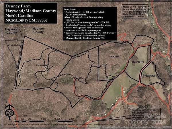 Rare large wooded land tract in Madison County on scenic Hwy. 209. Property has approximately 200 acres of hardwoods running from Highway 209 up to the ridge line boundary of Haywood County. 50 acres of pasture previously for beef cattle with old farmhouse and Tobacco barn. This property is not zoned and can be virtually anything from development to single family estate. Only minutes from Waynesville and Asheville. Land management and Forestry plan available upon request.Tax exemption available *Adjacent 100 wooded acres available ( See MLS 4098322)*