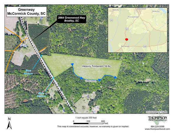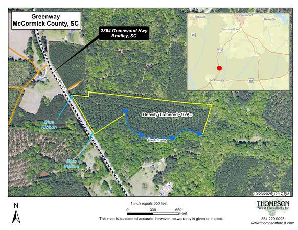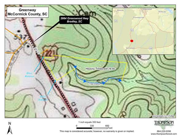 Est $1,010/moApproximately 16 acres along Highway 221 between the towns of Greenwood and McCormick. Heavy timber sits on the land, allowing for timber revenue and/or a majestic canopy for your getaway. A creek branch lies near the southern border-please look over the topographic map included. Forestland surrounds this property in an area known for its beauty and ownership stability. Fiber optic service! Acreage to be verified by surveyor. This property is McCormick County Parcel ID 148-00-00-017.