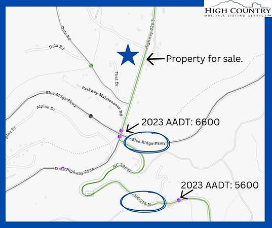 PRIME opportunity located on Highway 226 right right off the Blue Ridge Parkway! This property is right in the midst of everything: the Blue Ridge Parkway, the Mineral Museum, the Visitor's Center, Gem Mine, and even Walmart. City water, city sewer, and natural gas are all available here. There are so many ways to develop this property in the flourishing town of Spruce Pine! More acreage is negotiable. The BRP reported a visitor count of 16.7 million in 2023 and 2/.1 million visitors just in August of 2024! Did you know that the Blue Ridge Parkway is the most visited unit of the National Park Service, with more visitors than Yellowstone, Yosemite, and Grand Canyon national parks combined. Go to https://ncdot.maps.arcgis.com/apps/webappviewer/index.html?id=964881960f0549de8c3583bf46ef5ed4 to view the Average Daily Traffic information from NCDOT. Come tap into the potential of this property today! POTENTIAL OWNER FINANCING!