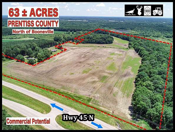 Est $1,833/moLocated in Prentiss County north of Booneville, this highly-visible tract has 1/4 mile of frontage on Hwy 45 with possible future commercial use. It's currently a small farm & hunting property, & it could be used for residential sites as well. There's a private asphalt road on the land that accesses 3 homes already. The tract has about 35 AC in crop ground, & it's got great appeal for deer & turkeys with 7-AC of big hardwoods & 15 AC of woods and wetlands along Polly's Creek. Community water & fiber internet available. Lots of potential. Great location. See photos!