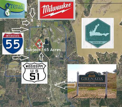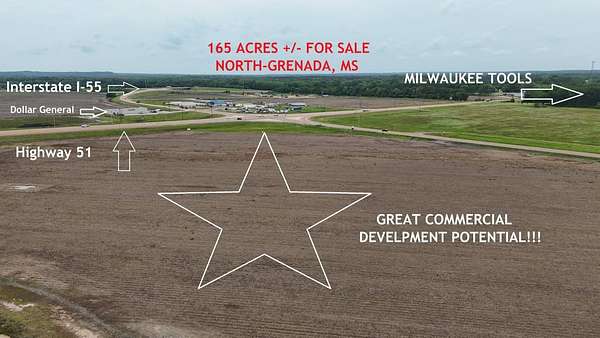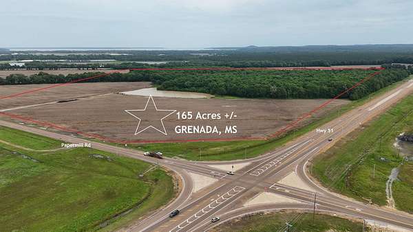 An exceptional 165-acre COMMERCIAL tract offering incredible flexibility and high visibility at the intersection of Highway 51 and Papermill Road, just off Interstate-55 in North Grenada. Currently zoned industrial, this mixed-use property features productive row crop land, beautiful mixed hardwood timber, and a private lake-creating both immediate utility and long-term investment potential. Positioned directly across from Grenada's brand-new Sports Complex and near the Expanding Business and Technology Park and Milwaukee Tools Facility. This location is ideal for COMMERCIAL DEVELOPMENT; including SHOPPING CENTERS, HOTELS, RESTAURANTS, STRIP-MALLS, or GAS STATIONS. Approximately 20 acres along Hwy 51 and Papermill Road are perfectly suited for IMMEDIATE development. Whether you're looking for an investment in Grenada's fastest-growing corridor or a large-scale commercial project site, this property checks every box.