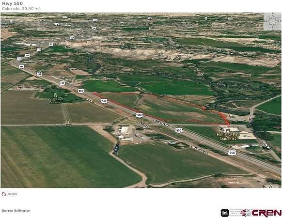 Est $6,149/moBurton Bullington, Shaffer Real Estate Company, C: 970-596-4744, burtonbullington@gmail.com, www.crenmls.com: Outstanding investment opportunity just south of Montrose along Highway 550! This 20-acre property offers prime visibility with constant traffic exposure and convenient access from both Highway 550 and Racine Road. Featuring priority water rights and stunning mountain views, this versatile parcel holds tremendous potential for a wide range of commercial or mixed-use developments. A rare find in a rapidly growing corridor -- come take advantage of this investment/business opportunity.