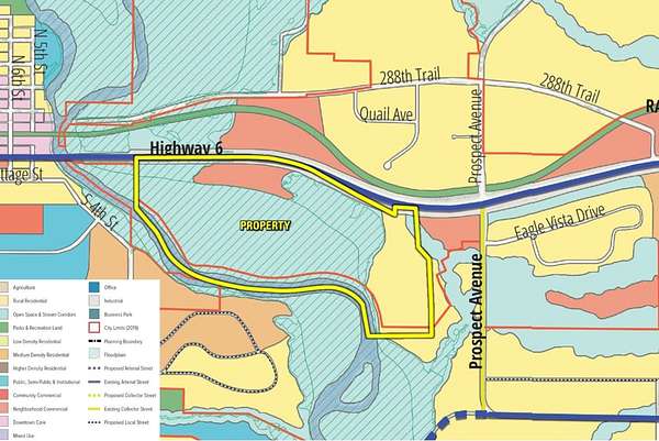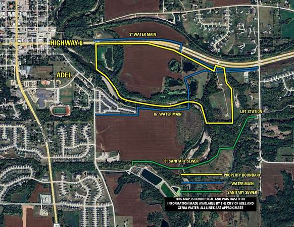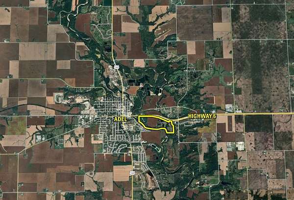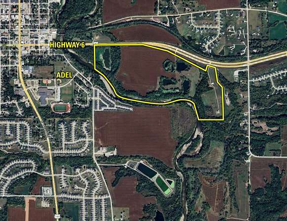 Peoples Company is proud to present 156.45 acres m/l located within the growing city limits of Adel, Iowa. Ideally positioned along the south side of Highway 6, this versatile property offers a rare combination of income-producing farmland, scenic recreational ground, and long-term development potential. The property features approximately 87.08 FSA cropland acres, with about 56.50 acres currently in crop production. Roughly 30 acres are leased as pasture, and the remaining acres consist of scenic recreational land along the Raccoon River-offering exceptional natural beauty, abundant wildlife habitat, and outdoor recreational opportunities. Currently zoned Agricultural, the property is included in the City of Adel's future land use plan, which outlines a mix of Community Commercial, Residential, and Open Space / Stream Corridor designations. Daily traffic counts along Highway 6 exceeds 10,000 vehicles (2024), enhancing visibility and access for future commercial or residential development. Additionally, the property lies adjacent to a sanitary sewer lift station and an 8" sewer main owned and maintained by the City of Adel and has a 16-inch water main running through the site -providing a significant advantage for future utility access and development. Additional improvements include a 65' x 45' steel storage building. The farm is currently leased through the 2025 crop season. The cell tower lease is for $910/month ($10,920 annually) and increases to $950/month ($11,400 annually) in August 2026 for an additional 5-year term. Under the cell tower lease, the lessee maintains a right of first refusal on the tower site and access drive. Contact the listing agent for more details.