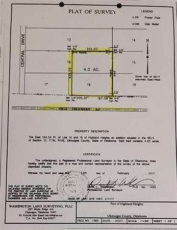 The east 393.50' of lots 16 and 18 of Highland Heights an addition situated in the SE/4 of section 10 T 11N R12 E Okmulgee County, State of Oklahoma said tract contains 4.00 acres