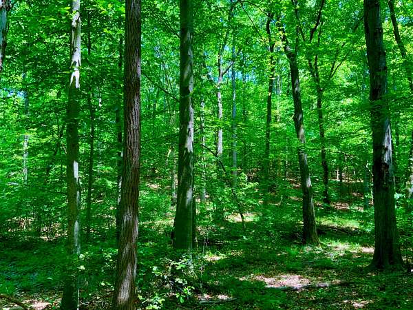 Mature hardwoods providing shade, habitat, and privacy