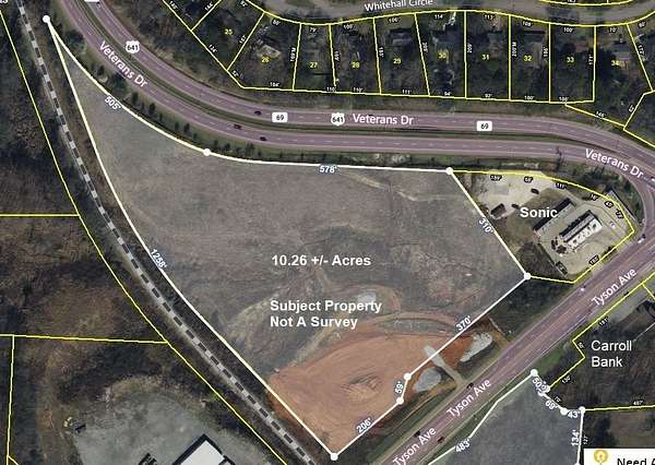 Est $2,448/mo10.26 +/- acres for Commercial Development located in a high traffic area in the City of Paris off US Highway 79 South and US Highway 641. Acreage joins Sonic Drive-In and is across the intersections from Carroll Bank and Shell Service Station. Features approximately 700 feet of frontage on Tyson Avenue/Highway 79 and 1100 feet on Veterans Drive/Highway 641 just a short distance from downtown Paris. Utilities and Grading plan available
