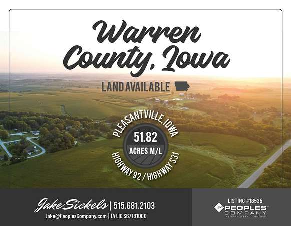 Peoples Company is pleased to offer this excellent 51.82-acre row crop farm with acreage potential, located just west of Pleasantville, Iowa, near the Warren/Marion County line. The property sits on pavement at the Highway 92/Highway S31 intersection near Beech and Sandyville, Iowa. This farm would make a great addition to an existing operation, a solid investment for those seeking quality tillable farmland in a strong agricultural area, or an ideal rural building site within the Pleasantville School District.