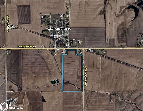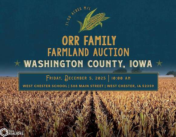 Mark your calendars for Friday, December 5th, 2025! We are proud to present 71.5 acres m/l located on the edge of West Chester, Iowa, in Washington County. The public auction will be held at 10:00 AM at the West Chester School, with live and online bidding options available. This highly productive farm includes 64.09 tillable acres m/l carrying an impressive CSR2 of 72.4. The farm lease has been terminated and will be open for the 2026 cropping season. Significant improvements were completed in 2020, including extensive tile and terrace work, making this property a top producer. With frontage along both paved IA Highway 92 and Hemlock Avenue, this tract offers excellent accessibility and versatility. It would make an outstanding building site for a home or business with highway visibility and rural appeal in a tightly held area. Located in Section 6 of Franklin Township, Washington County, Iowa, this property represents a great opportunity for a variety of buyers, whether you're looking to expand your existing operation, acquire a manageable and efficient tract as a beginning farmer, or invest in high-quality farmland in a strong agricultural region. The farm's prime location provides convenient access to multiple grain marketing facilities throughout the area. Don't miss this rare opportunity to purchase a well-maintained, high-producing farm in the heart of Washington County, IA.