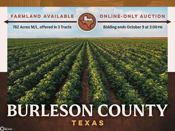 Presenting 762 acres m/l of high-quality farmland located just 10 minutes south of College Station in Burleson County, Texas. This rare offering will be sold via online auction and is available in three individual tracts, ranging in size from 181.35 acres to 330 acres m/l. Situated in the fertile Brazos River Bottom, the farm is comprised primarily of productive Ships clay and Belk clay soils, with a long-standing history of successful cotton, corn, and sorghum production. The farm is currently leased through the 2025 crop season and will be available to farm or operate beginning in 2026, presenting an excellent opportunity for producers, investors, or those looking to expand in a strong agricultural region. Farms in the river bottom are tightly held, and these tracts have not been available to the public in many years. Tract 1: 330.00 Acres M/L with approximately 315.89 tillable acres Tract 2: 251.00 Acres M/L with approximately 249 tillable acres Tract 3: 181.35 Acres M/L with approximately 162.00 tillable acres and 19.35 acres of timber The three tracts will be offered individually on a price-per-acre basis via an online-only auction, where each tract will be bid on separately and will not be combined. Bidding is open now and will close at 3:00 PM CST on Thursday, October 9th, 2025. Interested bidders must register and submit bids through our website.