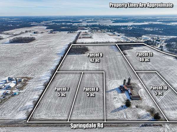 Parcel 9 - 42+- AcresLarge barn in need of demolition or extensive rebuild. Excellent investment parcel with approximately 34+- acres of tillable land and a 3.5+- acre woodlot along the north property line. Approximately 430+- feet of frontage along Springdale Road.