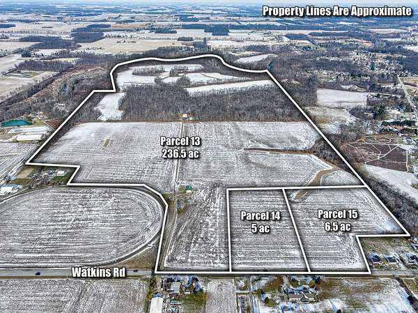 Parcel 13 - 236.5+- AcresIncredible investment opportunity. Approximately 129+- acres of productive tillable land featuring three pole buildings, one of which is finished as a cabin with water, septic, and electric. The property also includes mature woodlands and approximately 4,350+- feet of Mill Creek frontage, offering exceptional recreational opportunities including water sports and waterfowl hunting. This property presents an excellent opportunity for an executive home site combined with a premier outdoor recreational setting. Approximately 345+- feet of frontage along Watkins Road.