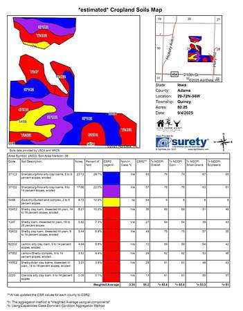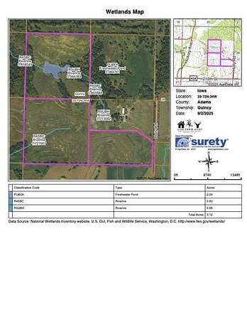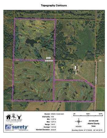 Bare land does not hit the open market in Adams County often, and this property houses possibilities for many. Imagine mornings in the tree stand followed by a break to fish or pheasant hunt in the fall. In the late season, set a tower blind high on the centralized hill to watch the property from all angles. Use the spring to add value through property clean up as well as fill your turkey tags & catch fish. Terraced hills make up the majority of the 99.2+/- acre property with the remainder being hardwood timber, drainage, and a stocked pond. FSA records show 80.75 cropland acres and income is currently generated through CRP (Conservation Reserve Program) payments of $285.79/acre on 72.25 acres for a total of $20,648 annually through 2027. The property could then be row crop farmed, turned to cattle pasture, or potentially re-enrolled into CRP. Adams County would allow building, if so desired, but there are currently no utilities on site. The property holds, and is surrounded by, an abundant amount of wildlife but has not been hunted in nearly a decade. Access is from the southeast leaving bedding areas and travel corridors unbothered to scent & sound. Property is monitored with cell cameras during the duration of the listing; trespassers will be held accountable. Contact to schedule a showing or to request mapping materials, more photos, or other documents.