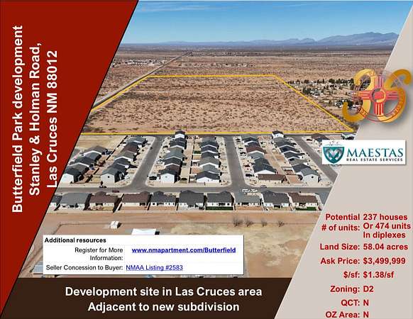 This 58-acre development site in Las Cruces offers a rare generational opportunity with prime frontage along a major arterial road and easy access to I-10/I-25, minutes from NMSU, White Sands Test Facility, and White Sands Missile Range. The land can accommodate approximately 200 duplex lots, with existing utilities and nearby infrastructure simplifying development.Las Cruces' economy is expanding, with employment up 1.5% year-over-year (about 1,200 jobs) and unemployment dipping to 4.4% in June 2025. Key industries driving growth include leisure and hospitality, professional services, education, and healthcare.