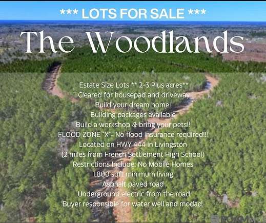 WELCOME TO THE WOODLANDS!! A brand new one of a kind development where nature and home blend together perfectly for a rarecountry living experience. Nestled among the trees, this one-of-a-kind subdivision features exclusive 2-acre-plus estate lots, offering unparalleledseclusion, privacy, and tranquility. A 100X100 area will be cleared along with a 20X75 ft driveway on each lot, ready to build on. Immerse yourself inthe serenity of nature, where beautiful trees and untouched greenery create a picturesque backdrop for your dream home. This community is designedto blend harmoniously with its natural surroundings, preserving the beauty of the land while providing the perfect place to unwind and reconnect withthe outdoors. Privacy Guaranteed with a preserved buffer of trees on the front and sides of every lot. Paved Access with smooth blacktop roadsthroughout the community. This is a prime location, conveniently just minutes from Ascension Parish, French Settlement Schools, and I-12, making itan ideal blend of rural charm and easy access to local amenities. Build your own dream home plans or take advantage of one of our beautiful buildingpackages available. No Flood Insurance Required!!