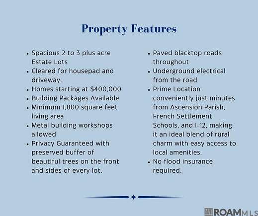 WELCOME TO THE WOODLANDS!! A brand new one of a kind development where nature and home blend together perfectly for a rarecountry living experience. Nestled among the trees, this one-of-a-kind subdivision features exclusive 2-acre-plus estate lots, offering unparalleledseclusion, privacy, and tranquility. A 100X100 area will be cleared along with a 20X75 ft driveway on each lot, ready to build on. Immerse yourself inthe serenity of nature, where beautiful trees and untouched greenery create a picturesque backdrop for your dream home. This community is designedto blend harmoniously with its natural surroundings, preserving the beauty of the land while providing the perfect place to unwind and reconnect withthe outdoors. Privacy Guaranteed with a preserved buffer of trees on the front and sides of every lot. Paved Access with smooth blacktop roadsthroughout the community. This is a prime location, conveniently just minutes from Ascension Parish, French Settlement Schools, and I-12, making itan ideal blend of rural charm and easy access to local amenities. Build your own dream home plans or take advantage of one of our beautiful buildingpackages available. No Flood Insurance Required!!