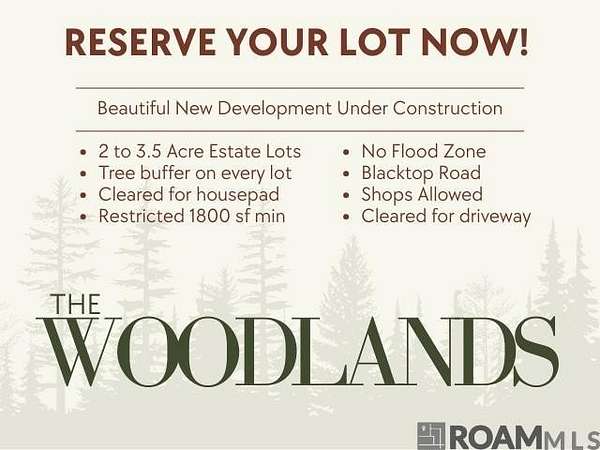 Come experience The Woodlands! A brand new, one of a kind development where nature and home blend together perfectly. Nestled among the trees, these 39 gorgeous lots have been cleared for the house pad and driveway and are ready to build on. This unique subdivision features exclusive 2-acre-plus estate lots, offering unparalleled privacy and tranquility. Immerse yourself in the serenity of nature, where beautiful trees and untouched greenery create a picturesque backdrop for your dream home. This community is designed to blend harmoniously with natural surroundings, preserving the beauty of the land while providing the perfect place to unwind and reconnect with the outdoors. Privacy is a guarantee with a preserved buffer of trees on the front and sides of every lot. Paved access with smooth blacktop roads. Prime location, conveniently just a short drive from Prairieville, Gonzales, Juban Crossing, and Baton Rouge. It's the ideal blend of rural charm and convenience with easy access to nearby amenities. Take advantage of one of our beautiful building packages, or let us build you a custom dream home. No Flood Insurance Required!!
