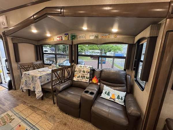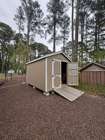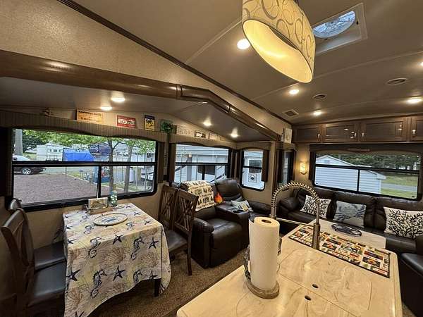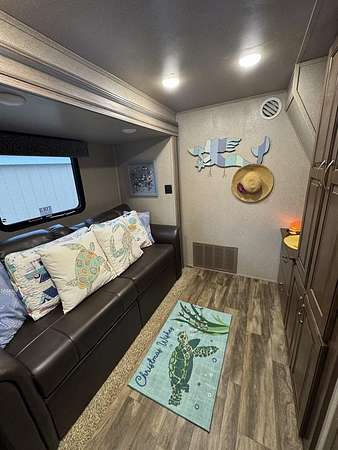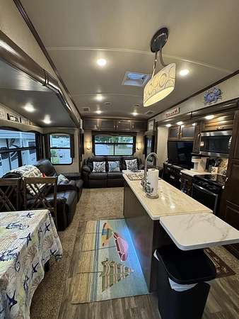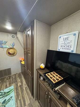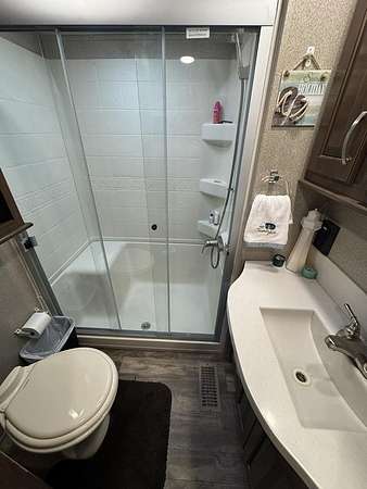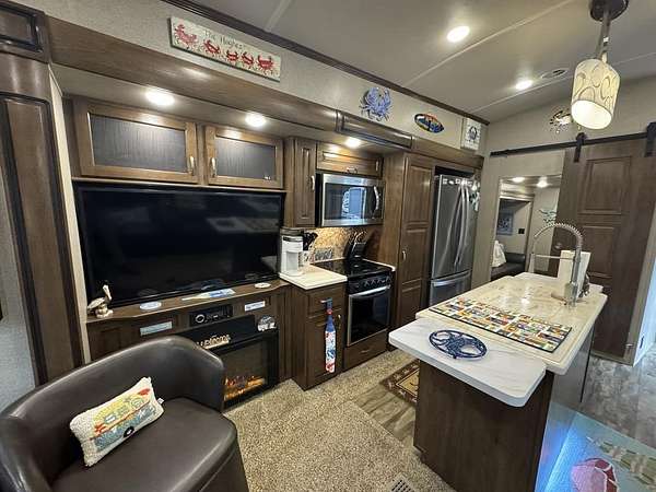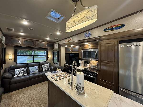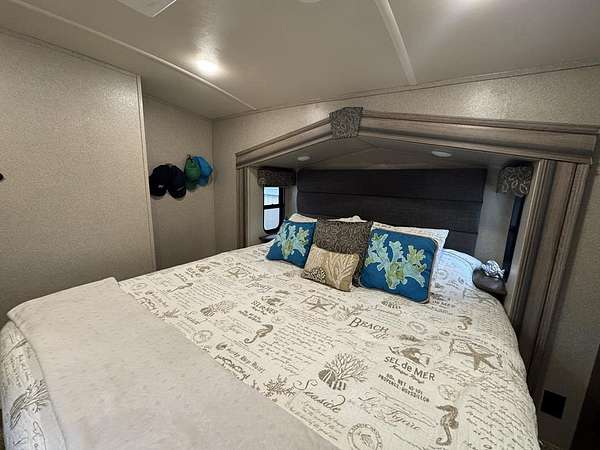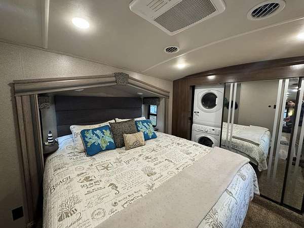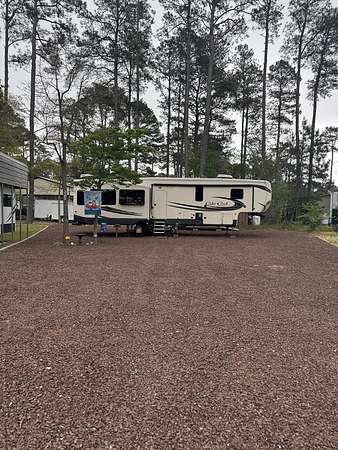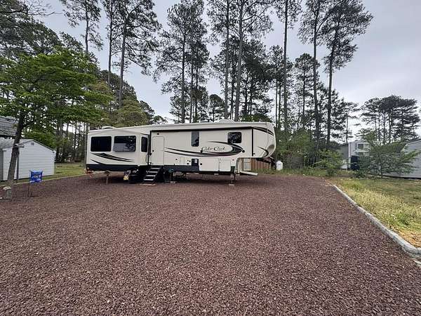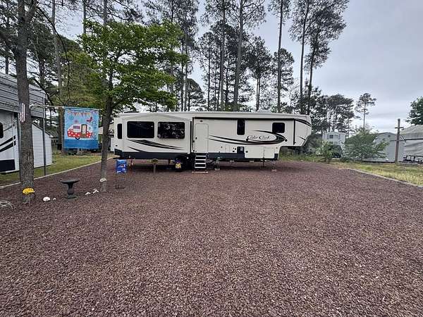 Est $705/mo2018 Fifth wheel. Two bedroom, One bathroom, with third sleeping area loft, open living area. Very high end unit. Located on an oversized lot with large shed and septic on site. Entire lot is red stoned. Includes access to pool, fishing pier, crabbing pier, marina, clubhouse, boat ramp, boat slips, kayak launch, pickleball court, playground, pavilion, and more.