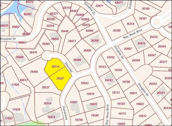 FM 2147 West to south onto Bay West Blvd. Left on Florentine. Left onto Discreet. Lots are on the left hand side of Discreet as you enter.