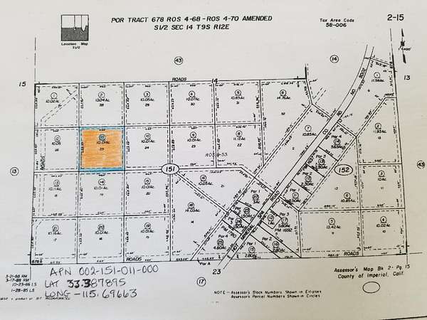 Est $282/moNiland, Ca. Just NE of Bombay Beach. 10 acres More or Less located SW'ly of Hot Mineral Spa Rd. N of Hwy 111. Zoned S-1-RE. which allowes for many potential uses including Renewable Energy. You own the Land, No HOA's. Surrounded by Hot Mineral Spa's local in the area as well as very popular neighboring town of Bombay beach just minutes away. Perfect for the investor build your farm, winter getaway or family compound. Lat: 33.387895 Long: -115.69663 APN 002-151-011-000. Imperial County. All information deemed reliable however buyer to do their own due diligence to satisfy themselves.