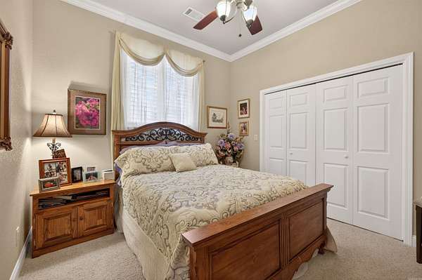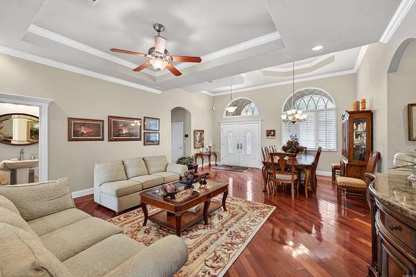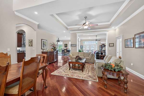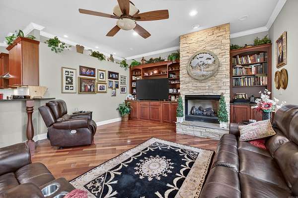 STUNNING VIEW of Diamante 17 green & beyond, as well as the 18th tee. CUSTOM HOME has been well-cared-for. WALLS OF WINDOWS & a gas logs FIREPLACE make for a spectacular DEN that opens to a beautiful sunroom. hardwood floors flank the foyer, living room, dining room, den, kitchen, office, breakfast area. kitchen & breakfast area open to den w TV & fireplace. Arkansas room has tile flooring, a fireplace & gas cooktop. French doors lead to a deck overlooking the large pond, Diamante 17 green & 18 tee. Cart path is on opposite side across pond & golf course. Enjoy the view without the distractions. Oversize lot is .66 acre. primary suite opens to Arkansas room. guest bedrooms & bath are separate from primary suite. powder room. laundry has sink & ice machine. oversize 3 car garage. irrigation. 2026 roof. located on a cul-de-sac with vacant wooded lot adjacent to property. paved cart path at end of cul-de-sac leads to Diamante clubhouse, swimming pool, tennis and pickleball courts, golf course & practice facilities. property owners receive 3 free rounds of golf per month for family & friends. Diamante country club is home to Golf Digest #4 ranked AR golf course.