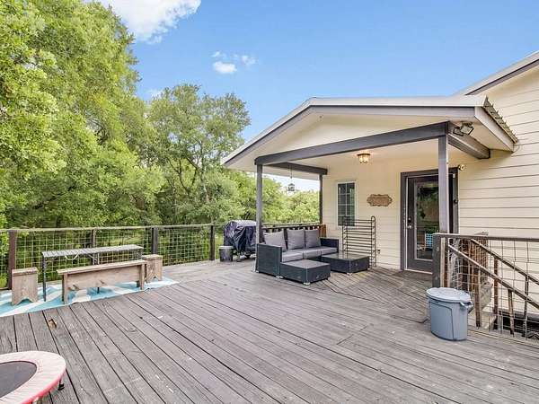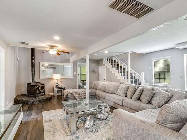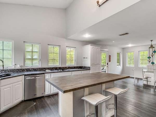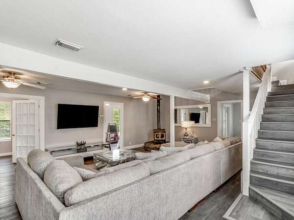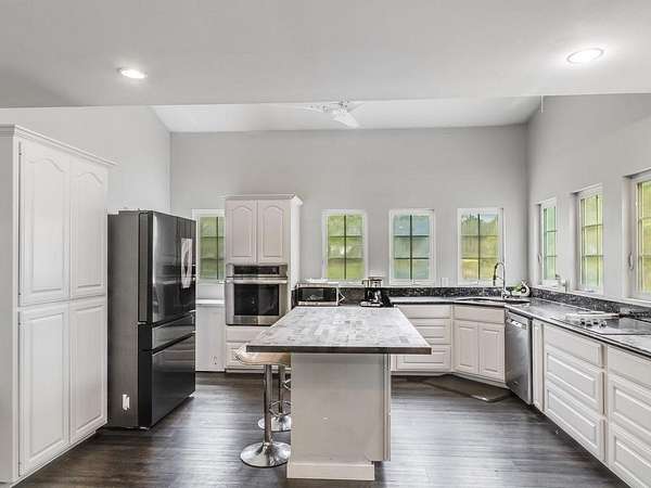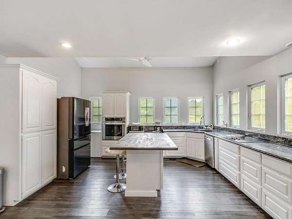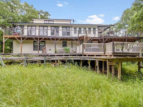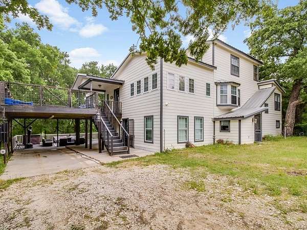 20880 N FM 709 in Hubbard, offers 19.74 ag-exempt acres with a private pond and a 4,050 square foot home positioned off the road among mature trees. Located in Navarro County within Dawson ISD, the property sits just minutes from State Highway 31, providing access to Hillsboro, Corsicana, and approximately 40 miles to Waco. The home spans three levels and includes multiple living areas, creating flexibility for a variety of uses. The main living space features a wood-burning fireplace and exposed beam accents. Large windows throughout the home provide natural light and views of the surrounding acreage. The kitchen includes white cabinetry, granite countertops, stainless steel appliances, and a large center island designed for gathering and daily use. An eat-in area and separate dining space provide additional functionality. The primary bedroom includes an ensuite bath and walk-in closet. Additional bedrooms are positioned across levels to allow separation and privacy. Outdoor living is a defining feature of this property. Expansive wraparound decking and elevated sections overlook wooded acreage and the private pond. The land offers space for trails, recreation, gardening, livestock, or future improvements. The agricultural exemption is currently in place, which may reduce annual property taxes.