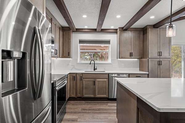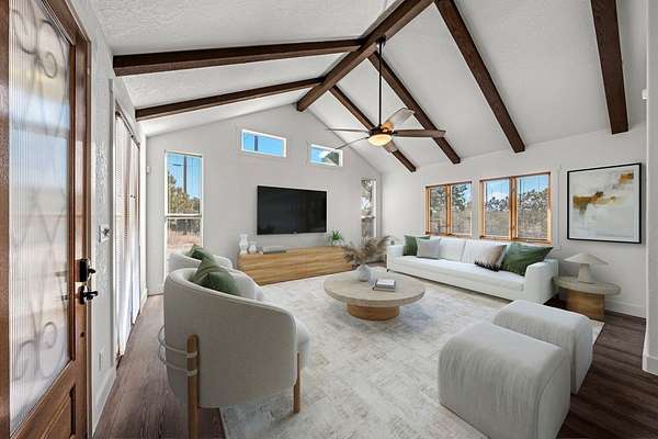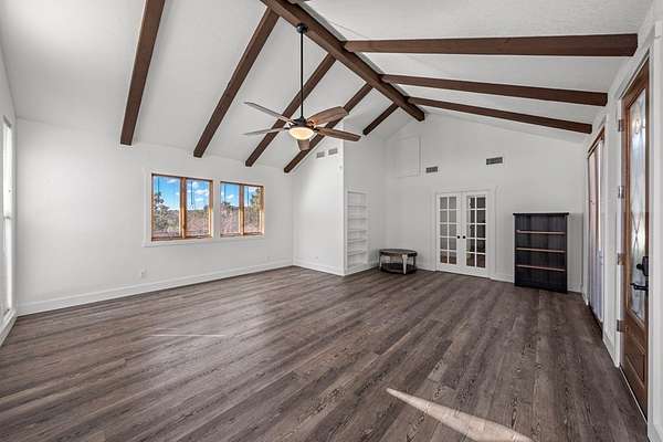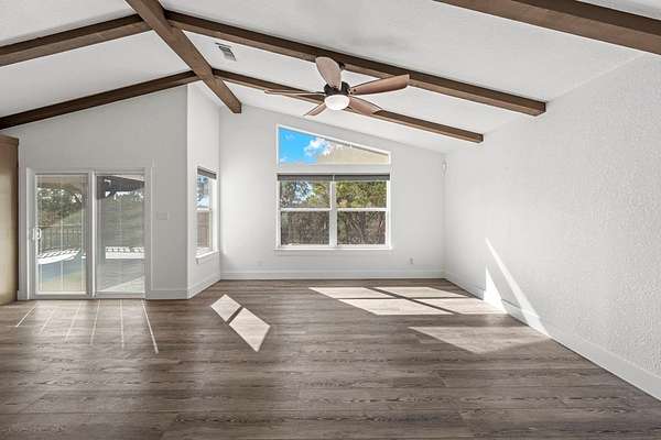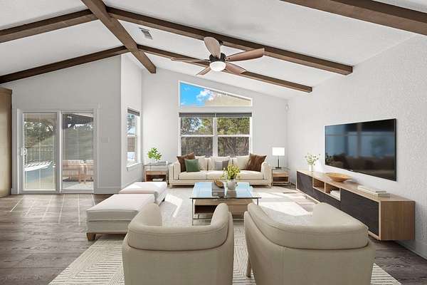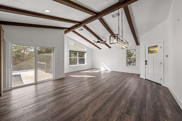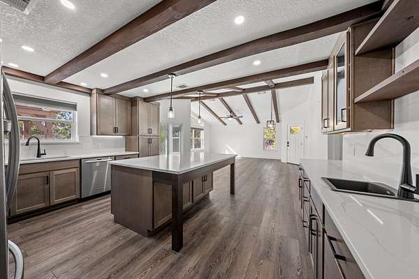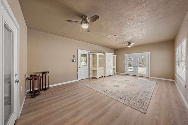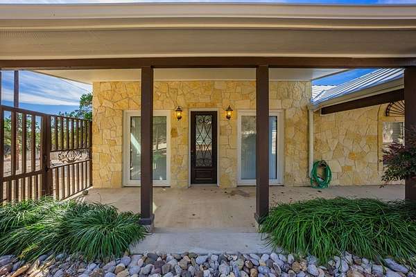 HILLTOP VIEWS- this private retreat offers sweeping views & a complete remodel (10/2024). Designed as a true compound, the home blends style, flexibility, & function-ideal for multi-generational living, hosting guests, or working fm home. A custom kitchen anchors the main living space w/quartz counters & backsplash, under-counter lighting, breakfast bar, & an integrated dining area. The main area incl prim suite, 2 add'l bedrms, 2 full bths, kitchen, living room, & laundry. Down the hall is a full bath, large bedrm, & 2nd living area - perfect guest or extended-family wing. Upgrades incl flooring, hardware, quartz counter-tops, doors & vaulted ceilings highlighted w/wood beams. Sliding doors open to a vast back porch w/covr'd area. Enjoy an impressive 80-ft front porch w/fans & lighting overlooking lush green AstroTurf-ideal for putting practice & games. Terrace garden spaces on both sides are fenced w/drip system. Add'l features: 24'x40' 3-bay metal garage; wrkshp/shed; 1.5 bay garage w/attached studio living space, office & activity space (perfect for podcasts, yoga, or a game room), fenced side yard for animals; 26-kW generator; 1,000-gallon propane tank; & an 8-camera sec syst