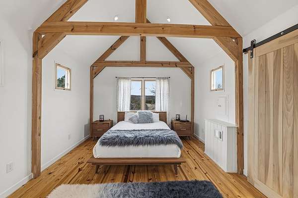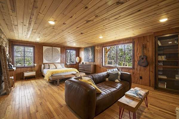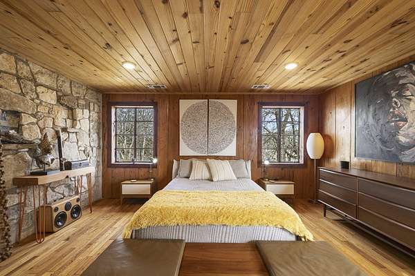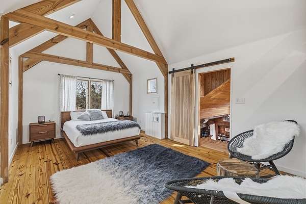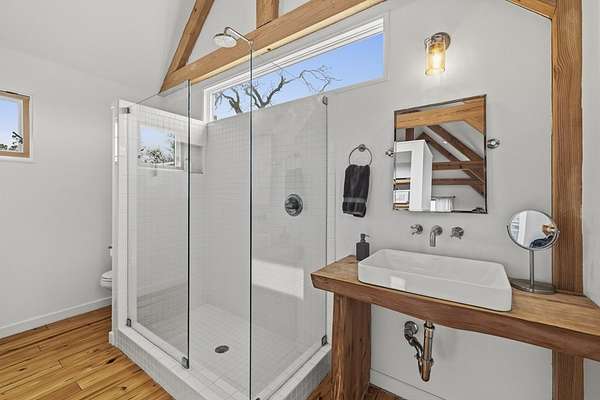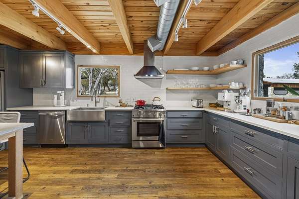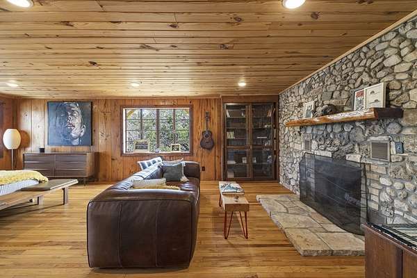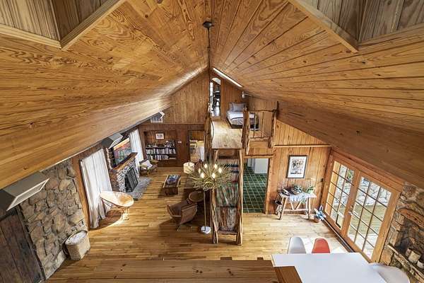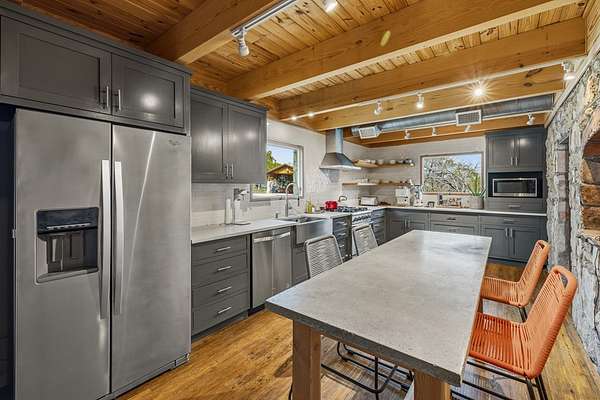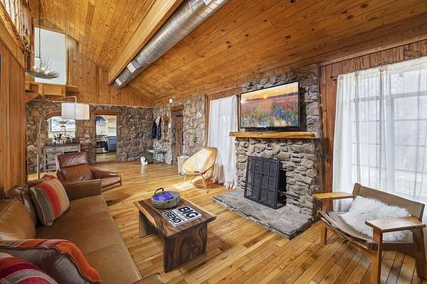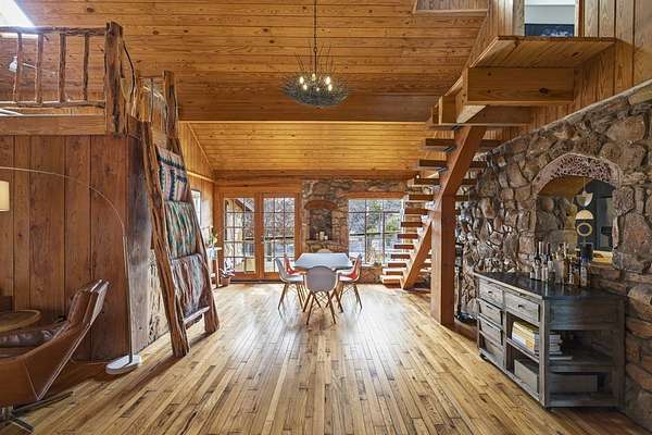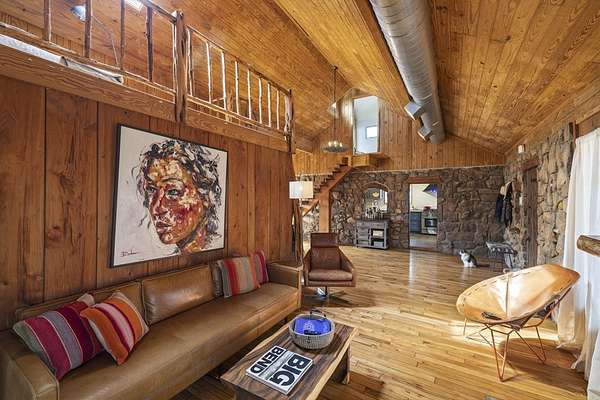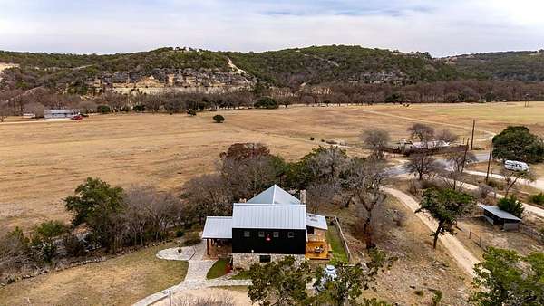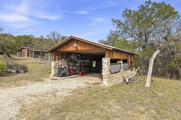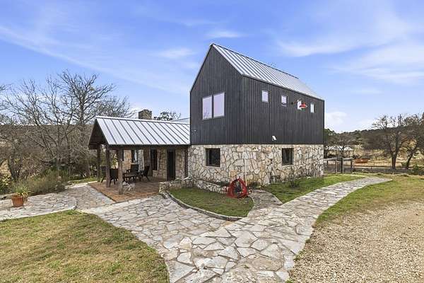 Timeless Character - Modern Style. Set on 5.32 private acres in Hunt, TX, this architecturally distinctive 2120 sq ft Hill Country retreat blends native stone, soaring vaulted wood ceilings & rich hardwood floors w/an open-concept design created for effortless flow. Enter through a handcrafted wood & metal embellished door into a distinctive living space anchored by a stone fireplace & filled w/natural light. The thoughtfully designed kitchen features custom cabinetry, stainless appliances, floating wood shelving & generous prep space framed by exposed beams & clean architectural lines. Large primary w/stone fireplace & ensuite tiled bath. A floating staircase leads to a private guest suite w/ensuite bath, while an additional upstairs flex room w/loft offers ideal space for an office, art studio, or additional bedroom. Enjoy expansive views from the covered front patio & unwind on the private back patio. The property is fully equipped for Hill Country living w/RV storage, carport, animal pens, chicken coop & multiple outbuildings. Mature trees & usable acreage provide privacy, versatility & potential for full-time living, a weekend escape, or income opportunity! Must See!