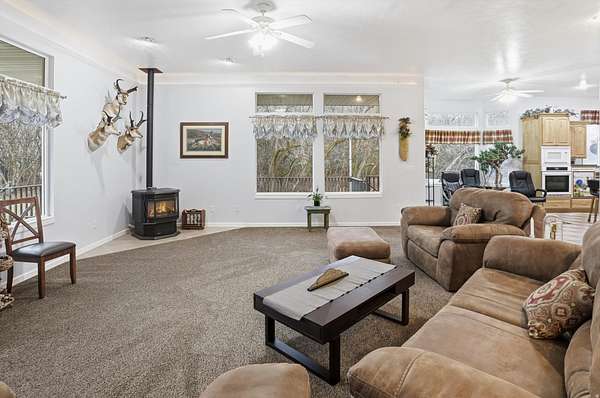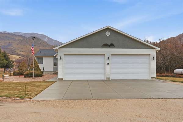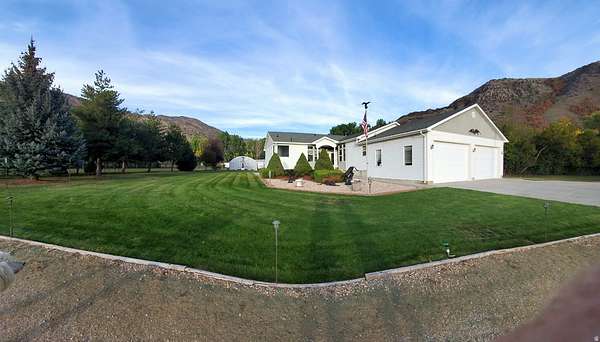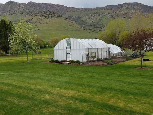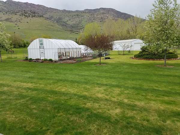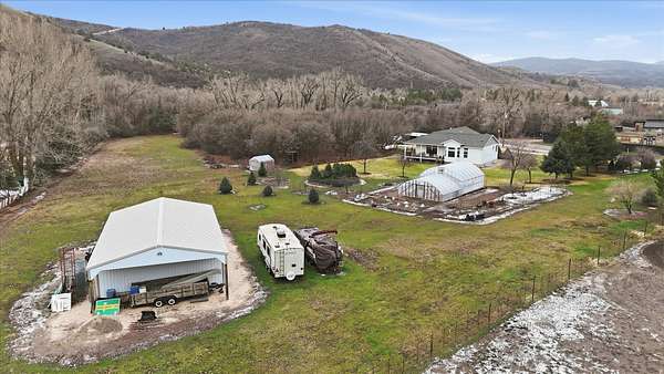 Beautiful rambler on 5 acres, lovingly cared for by one owner and thoughtfully designed for true main-level living. ADA ready with 36" doorways, this home offers everything you need on one level, including a spacious primary ensuite with a huge walk-in closet and abundant natural light throughout. Major updates include a new HVAC system and hot water heater installed in 2023. The attached 4-car garage provides ample space, while the property truly shines outdoors with a private setting, stunning mountain views of Snowbasin and the surrounding peaks, and meticulously maintained grounds that blend seamlessly with nature. Enjoy a greenhouse with 220 heater, garden area, chicken coop, and fruit trees including peach, cherry, apricot, plum, and apple. Additional features include a 30'x40' Cleary building, Conex container for extra storage with wood awning, RV dump and 220 plug, and plenty of parking for RVs, boats, and all your toys. Bring your animals and enjoy peaceful walks along the charming path, host gatherings with friends, or unwind under the stars-this exceptional property offers the perfect backdrop for every season. Schedule your private showing today and experience all the beauty and possibilities this unique property has to offer.