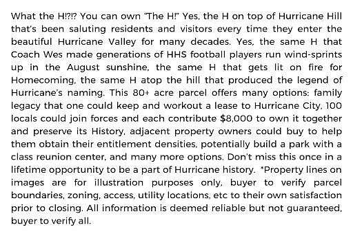 What the H!?!? You can own ''The H!'' Yes, the H on top of Hurricane Hill that's been saluting residents and visitors every time they enter the beautiful Hurricane Valley for many decades. Yes, the same H that Coach Wes made generations of HHS football players run wind-sprints up in the August sunshine, the same H that gets lit on fire for Homecoming, the same H atop the hill that legend has it Hurricane obtained it's name. This 80+ acre parcel offers many options: family legacy that one could keep and workout a lease to Hurricane City, 100 locals could join forces and each contribute $8,000 to own it together and preserve its History, adjacent property owners could buy to help them obtain their entitlement densities, potentially build a park with a class reunion center, and many more
