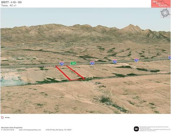 Est $211/moGreat investment acreage with amazing views just off of I-10, 7 miles East of Van Horn. This property can be utilized as a homestead or a commercial property. Interstate frontage road access opens this property to bank financing! If you are looking for more land, 3 other 10 acre tracts also being offered. Call Garrett!