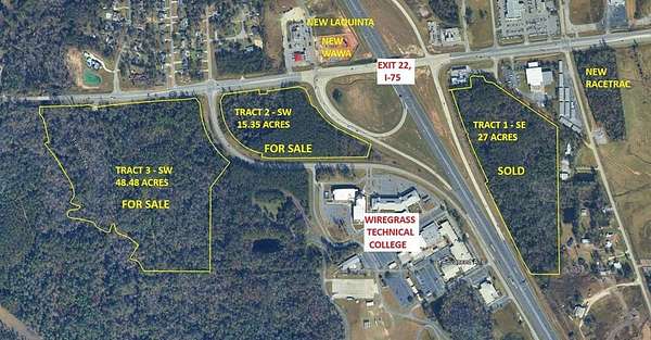 48.48 acres residential-commercial development / investment land, SW quadrant I-75, Exit 22, SW corner Shiloh Rd & Val Tech Rd. Close to southbound on & off ramps. Zoned R-1, priced based on $39,000/acre for all. Owner may consider selling less than full tract at negotiated terms. Summary attached in Documents (Tract 3 - 48.48 acres). Adjacent tract for sale: 15.35 acres east across Val Tech Rd under separate listing. Purchase together or separately. County water & sewer at or near site. High-growth area next to Wiregrass GA Technical College. Traffic: 61,900/day I-75; 19,400/day North Valdosta Rd. Valdosta, GA is one of America's strongest tertiary markets - known as Titletown, USA; Capital of South Georgia; Gateway to Florida. Multiple community assets including I-75, Moody AFB, Valdosta State University & South GA Medical Center supplement a 12-county hub market population of 500,000. Halfway between Atlanta & Orlando.