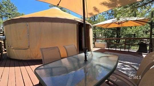 Would you love to have your own weekend getaway? Escape the city life and come to the woods to relax. This property is a charming 4.94 acre getaway, featuring a comfortable 24' yurt that accommodates 6 or more guests within its 452 sq feet. Being nestled in the trees, adjacent to thousands of acres of BLM public land gives the perfect opportunity for hiking, hunting, and relaxation. Do you want a base camp for a hunting trip? The yurt comes fully-furnished with a well-equipped kitchen with a propane cook stove, solar lighting, and other home-like amenities that make it extra comfortable! Wood stove, outdoor covered seating on the deck, a storage shed for your convenience, seating around the fire pit, and a delightful wooden swing with a view. Enjoy the outdoors on the spacious 26' deck as you take in the serene surroundings. With the option to drill a water well and have a septic installed, you could improve on what is already here. This idyllic retreat will have you rested and rejuvenated with a great camping experience. 4-wheel drive vehicle or a higher clearance vehicle is recommended for access.