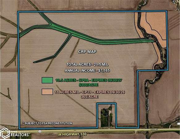 Marshall County, Iowa Sealed Bid Land Auction – I'm pleased to represent 170.73 acres m/l of premium Marshall County, Iowa farmland, ideally located just off Iowa Highway 330 and within a short drive of Marshalltown, Iowa. With excellent access and a strong agricultural presence in the surrounding area, this tract presents a rare opportunity in a highly regarded farming community. The farm will be offered via Sealed Bid Sale, with all bids due prior to 4:00 PM (CST) on April 15, 2026. The property includes approximately 143.75 acres currently in row crop production carrying an average CSR2 soil rating of 82.4, reflecting the quality and consistency of the soils. Located in Section 33 of Liscomb Township Marshall County, Iowa. Conservation Reserve Program "CRP" - Approximately 21.5 acres are enrolled into the Conservation Reserve Program with an annual payment of $7,165. Contracts are set to expire in September of 2026 and 2027. See attached "CRP Map" This farm features a desirable, well-laying topography that promotes efficient farming practices and strong productivity. Whether you are looking to expand an existing operation or secure a quality land investment in Central Iowa, this property checks the right boxes. Visit our websites for more information regarding this Auction.