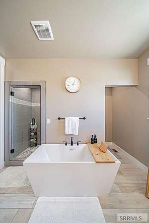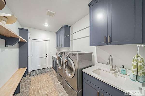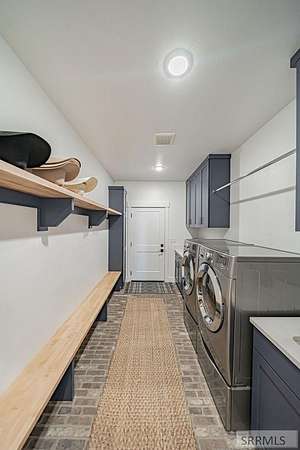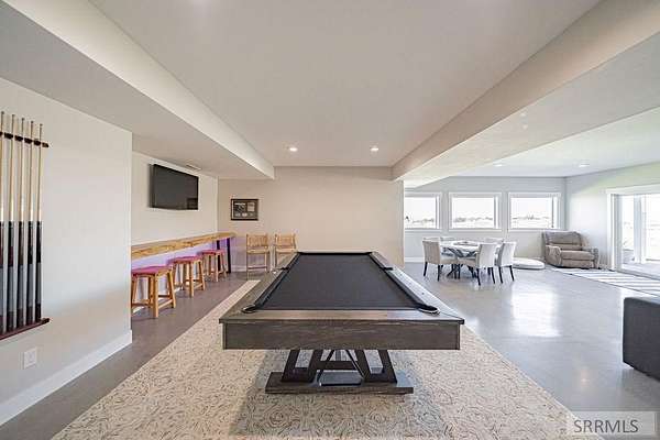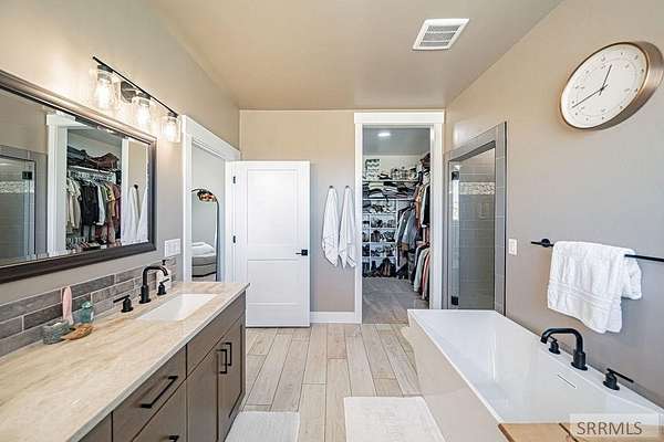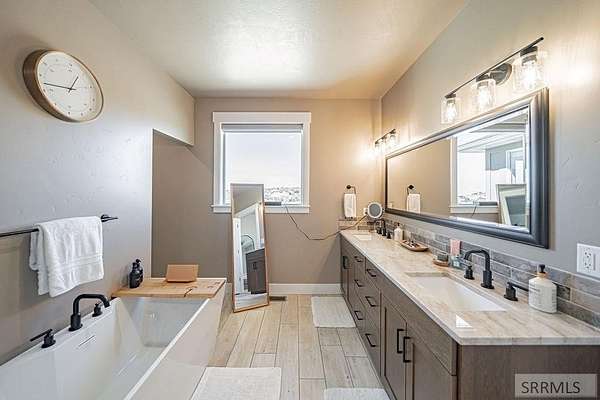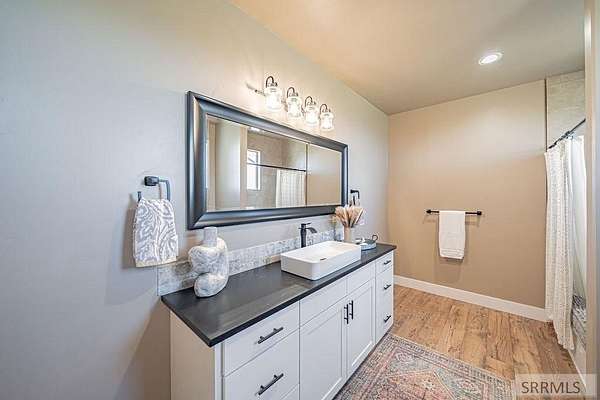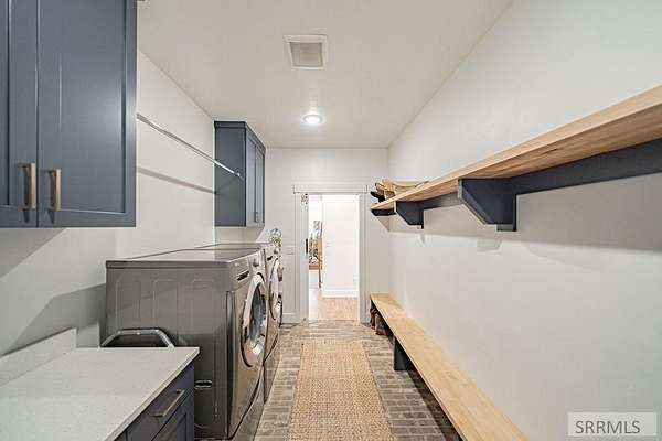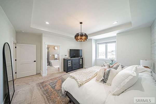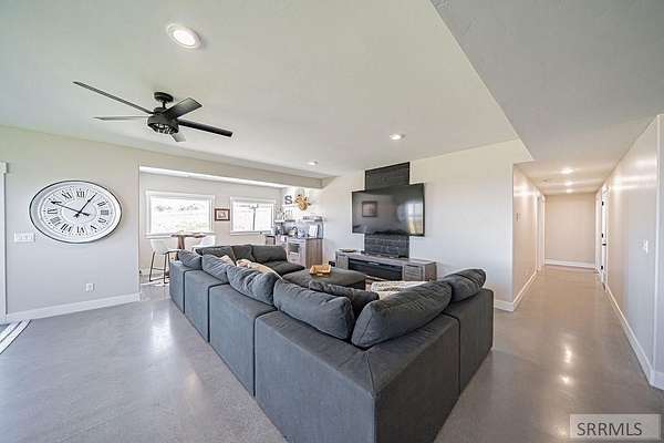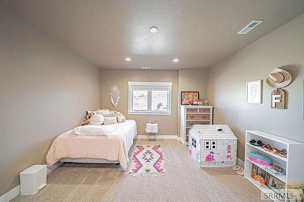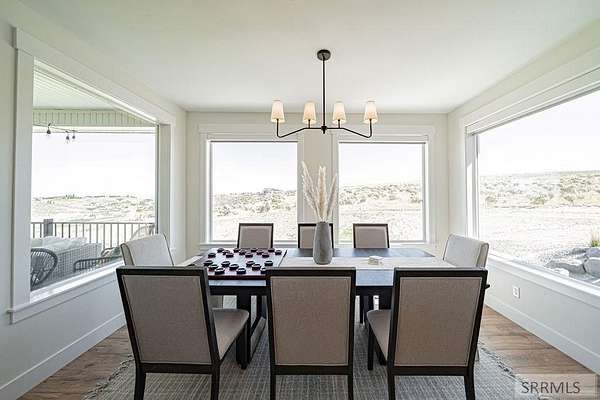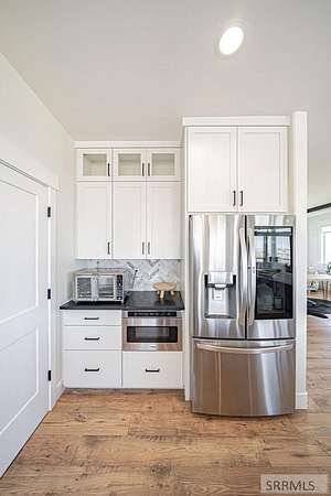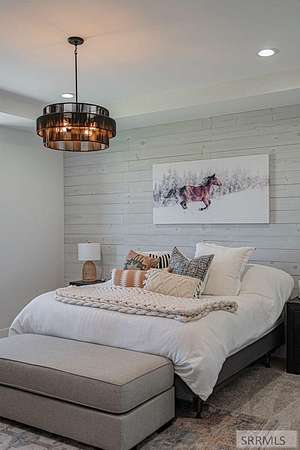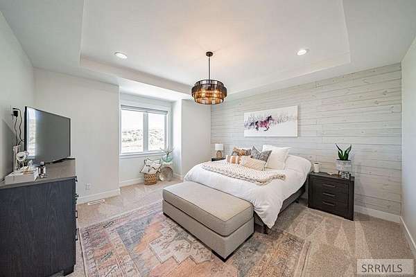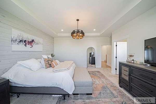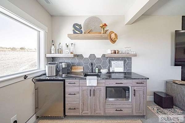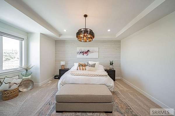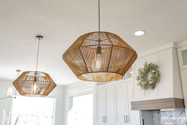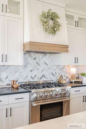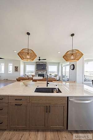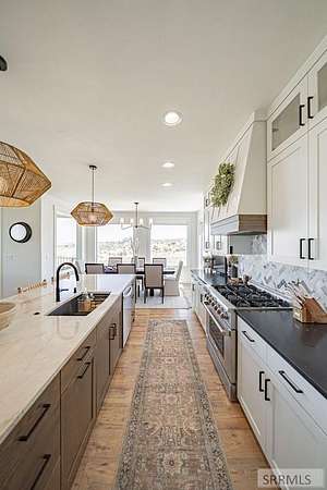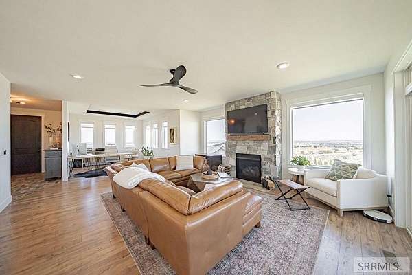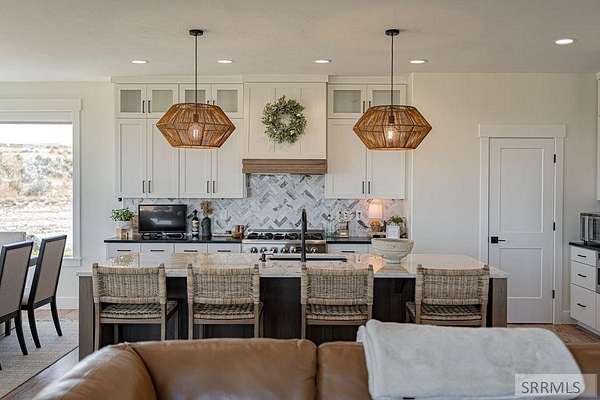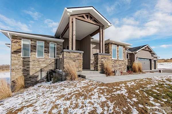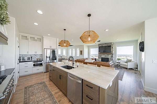 Built in 2022, this beautifully designed 4-bedroom, 3-bath home offers modern style, thoughtful details, and exceptional functionality. A striking brick-accented entry creates a warm first impression, while the open-concept layout is filled with natural light from large windows that showcase the surrounding views. The chef's kitchen features a Thor 36" professional gas range, quartzite and granite countertops, a large center island, and a walk-in pantry-ideal for everyday living and entertaining. Luxury laminate flooring with the look of natural wood adds warmth throughout the main living areas. The primary suite provides a private retreat with tray ceilings, abundant natural light, and a spa-inspired bathroom with a custom walk-in tile shower, double-sink vanity, private water closet, and a spacious walk-in closet with built-in shelving. The laundry room is both stylish and practical with durable brick tile flooring. The finished basement includes a large family room, cold storage, and a wet bar with refrigerator and microwave-perfect for gatherings. Outside, enjoy a landscaped lot with RV parking, open patio, panoramic views, hookups for a gas fire pit, BBQ, hot tub, and generator, plus room to build a shop and an oversized three-stall garage (approx. 1,445 sq ft).
