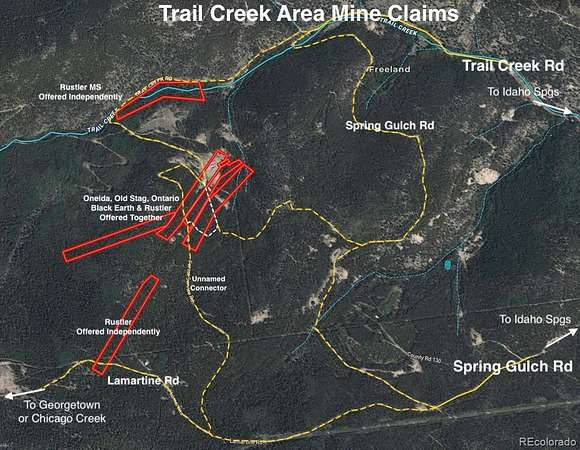 4X4 REQUIRED - The properties are best accessed from the Fall River Rd exit of I70. Take the exit to the south side frontage road Stanley Rd and turn left for 700' and take a hard right turn on to Trail Creek Rd (136) and travel 2.9 miles where it intersects with Spring Gulch Rd on the left. This is where the county maintenance ends. Continue along Trail Creek for another .6 mi to where Trail Creek Rd turns in to an unnamed Forest Rd, then continue up another .25 mi to the properties which are just beyond the abandoned mine buildings.