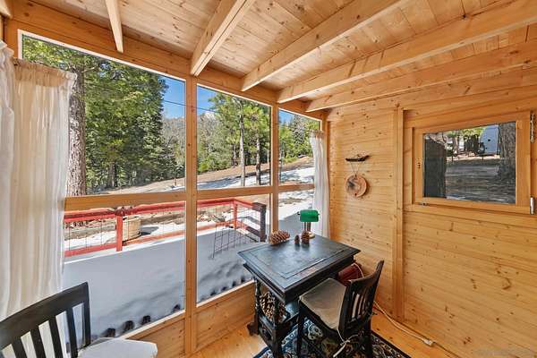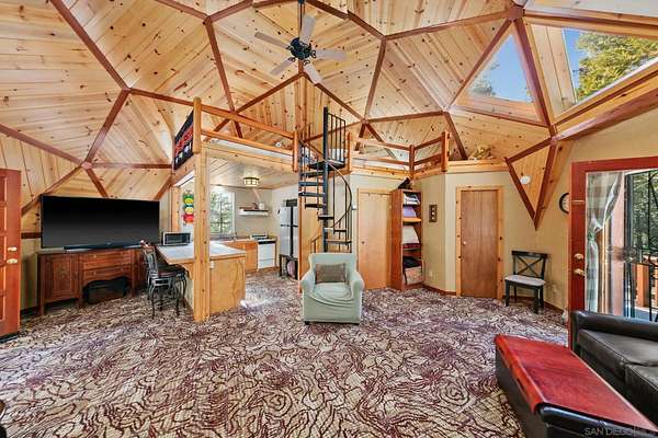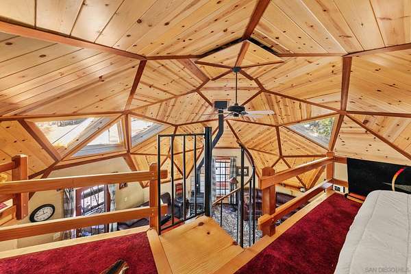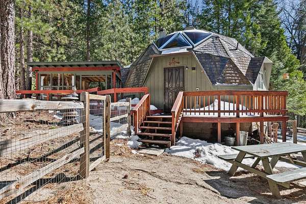 Secluded 1.80 acre Mountain Retreat in Pine Wood Discover a truly unique off-grid sanctuary nestled on 1.80 private acres in Pine Wood, just outside Idyllwild. This one-of-a-kind property features five separate structures, offering flexibility, privacy, and endless possibilities. The centerpiece is a spacious dome home with a spiral staircase leading to a loft for sleeping or storage, abundant skylights, a wood-burning stove, and a wall-mounted heater for year-round comfort. A small but functional kitchen and full bathroom complete the space. Additional structures include a separate guest house with a half bath and screened-in porch, a personal sauna, and a dedicated office with a screened-in deck, seamlessly connected to the home's wraparound wood deck. A storage shed with solar panels provides extra functionality. Surrounded by towering trees and abundant wildlife, this peaceful retreat offers well, septic, and propane, ensuring self-sufficient living in a serene, natural setting. Experience the ultimate mountain getaway while being just minutes from Idyllwild's charming shops, restaurants, and art scene.