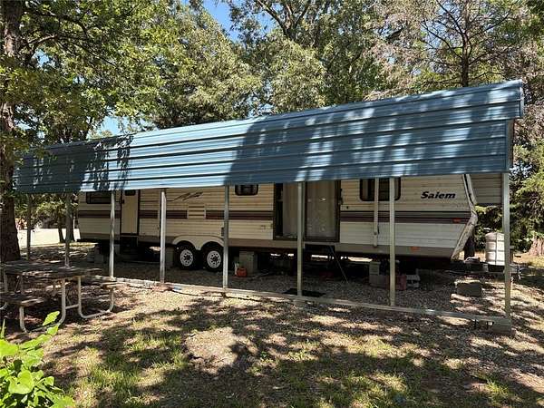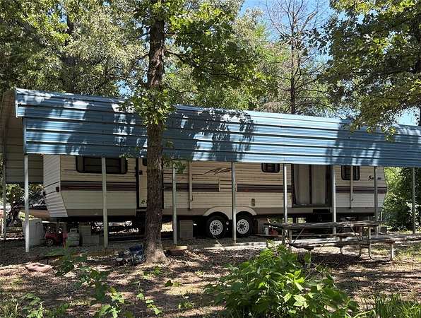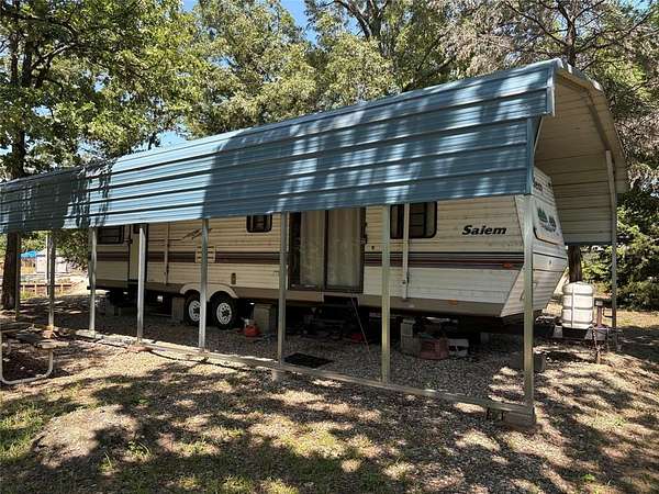 WATERFRONT on Lake Fork! Your opportunity to own 2 waterfront lots on World Famous Lake Fork with nearly 1 acre of additional SRA leaseback. These lot has some beautiful trees and views of the lake and plenty of privacy as these lots are located at the back of gated community. This is a ready to enjoy package with 36' camper (sleeps 8) and nice RV canopy already in place. These lots have a circle drive for plenty of truck and boat parking. This location is on a cul-de-sac for minimal traffic and noise. This private gated community allows RV living, clubhouse, restaurant, pool, picnic areas, community boat ramps, high speed internet available, trash service and more. Come enjoy the beautiful sunset and views at your very own getaway. These lake front lots don't come available very often and YES the RV is included.