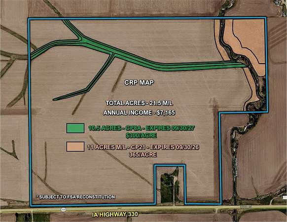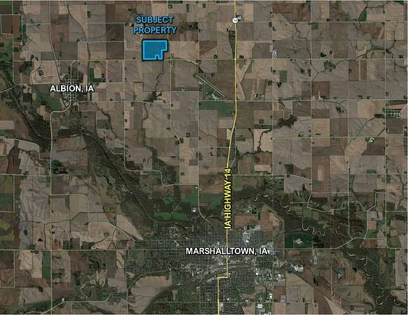 Marshall County, Iowa Sealed Bid Land Auction - I'm pleased to represent 170.73 acres m/l of premium Marshall County, Iowa farmland, ideally located just off Iowa Highway 330 and within a short drive of Marshalltown, Iowa. With excellent access and a strong agricultural presence in the surrounding area, this tract presents a rare opportunity in a highly regarded farming community. The farm will be offered via Sealed Bid Sale, with all bids due prior to 4:00 PM (CST) on April 15, 2026. The property includes approximately 143.75 acres currently in row crop production carrying an average CSR2 soil rating of 82.4, reflecting the quality and consistency of the soils. Located in Section 33 of Liscomb Township Marshall County, Iowa. Conservation Reserve Program "CRP" - Approximately 21.5 acres are enrolled into the Conservation Reserve Program with an annual payment of $7,165. Contracts are set to expire in September of 2026 and 2027. See attached "CRP Map" This farm features a desirable, well-laying topography that promotes efficient farming practices and strong productivity. Whether you are looking to expand an existing operation or secure a quality land investment in Central Iowa, this property checks the right boxes. Visit our websites for more information regarding this Auction.