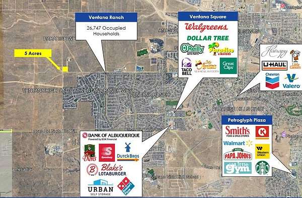 Est $3,372/moPROPERTY SUMMARYa-- Price: $498,8000a-- 5 Acre Lot SF: 217,800a-- Price/SF: $2.29a-- 1000Feetfromutilities at Ventana Rancha-- Medium Density Residential and Open Spacea-- Situs Address: Rio Rancho NM 87114a-- Area: 120 - Paradise West a-- County: Bernalilloa-- UPC: 100806615502530102a-- VPD: 2800 on Irving Blvd.