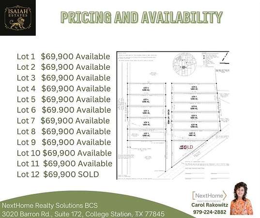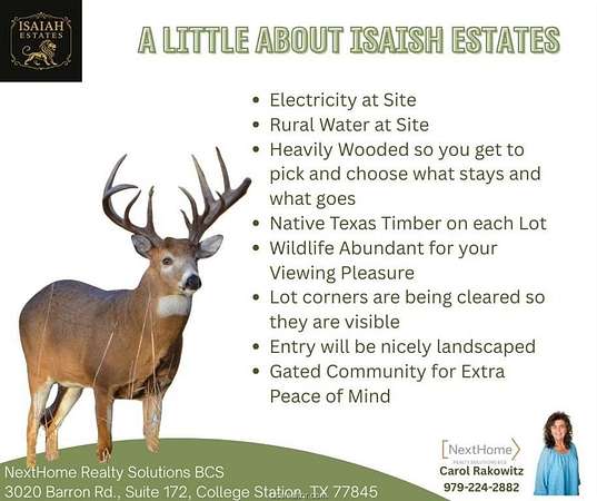 NEW SUBDISVISION nestled in the heart of the Texas Triangle and hundreds of beautiful trees! The perfect homesite awaits. 11 Lots are still available at the low price of $69,900 per 1 Acre lot with light restrictions. You gotta get out there and see what country living (but still close to it all) is really like. Prime Texas Homesite Gated Community for Extra Peace of Mind Power at Site Rural Water Already at the Ready Thick, Heavily Wooded Acreage Native Texas Timber All Around Wildlife Everywhere in the Heart of the Texas Triangle Along the Proposed I-14 Corridor Easy drive to Bryan-College Station and TAMU Call to schedule a showing today! Talk to agent about preferred builder and program possibilities.