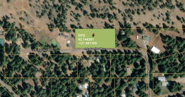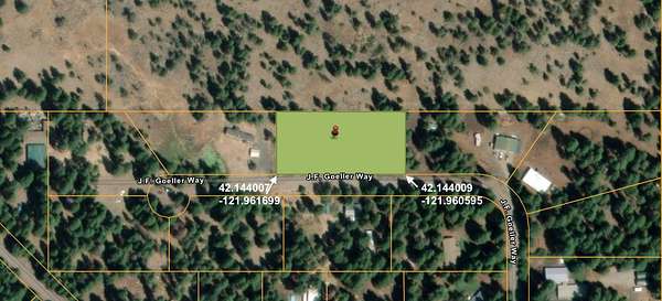 Take Clover Creek Rd, Left to Freight Road Lane, Right on to Ponderosa Lane, Left on JF Goeller Way. GPS: 42.14403, -121.96114