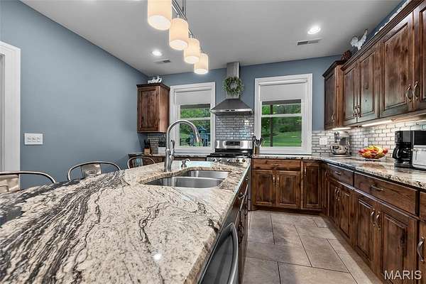 - Custom Cabinetry, Granite Counters, Kitchen Island, Kitchen/Dining Room Combo, Open Floorplan
