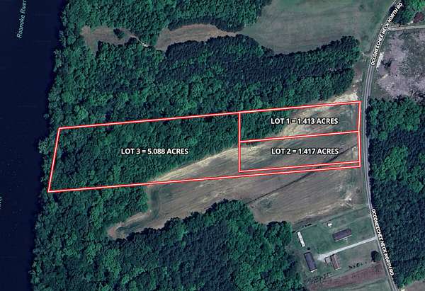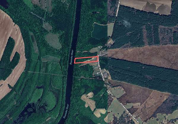 The property consists of three combined lots and features approximately 275+/- feet of frontage along Occoneechee Neck North Road, as well as 275+/- feet of water frontage along the Roanoke River. Roughly 3+/- acres of the property are open, tillable ground, with the remainder consisting of mixed hardwood and pine timber. The land gently slopes from approximately 70 feet of elevation along Occoneechee Neck North Road and descends to about 40+/- feet in elevation at the western property boundary along the River.