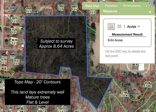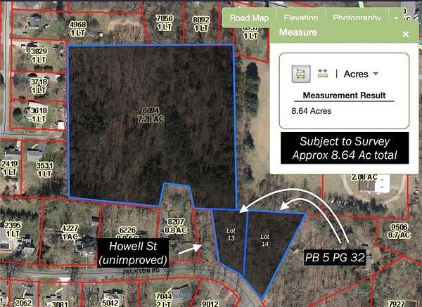 8.64 +/- acres. The land is level and wooded with several gorgeous building sites on the property. Howell road is unimproved and is not included in the acreage amount. Would make for a great driveway entrance. Includes lots 13 &14 of Plat Book 5 - Page 32 and a 7+ acre parcel (combined). Recommend a new survey. Call today!