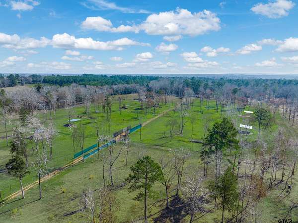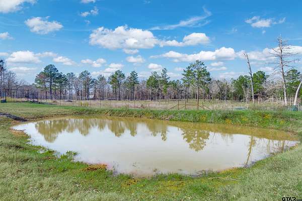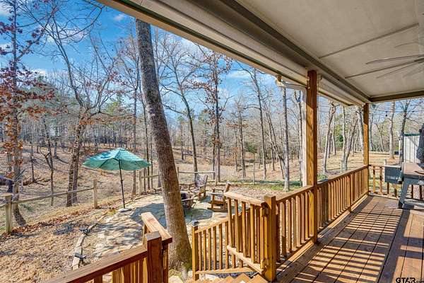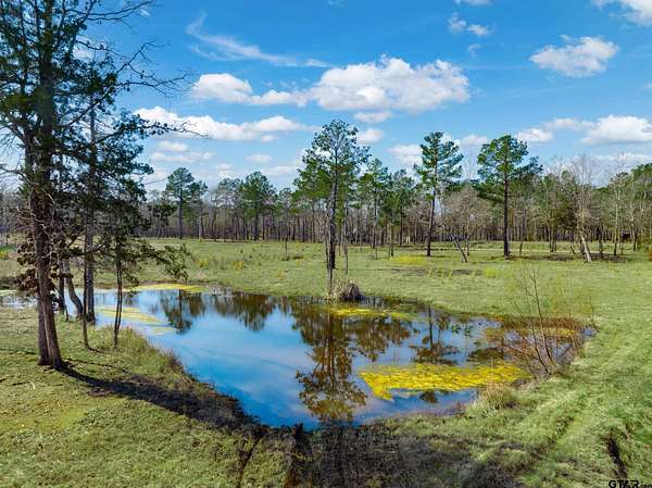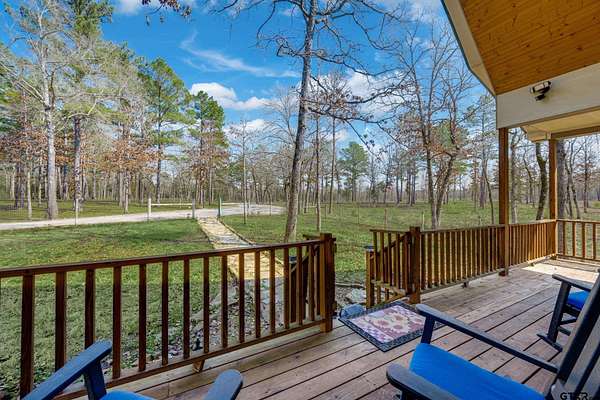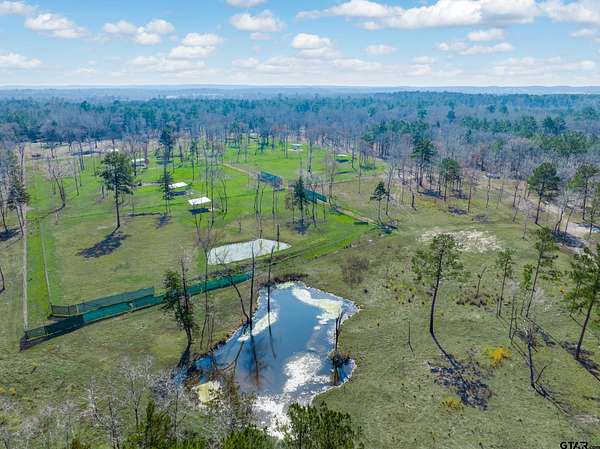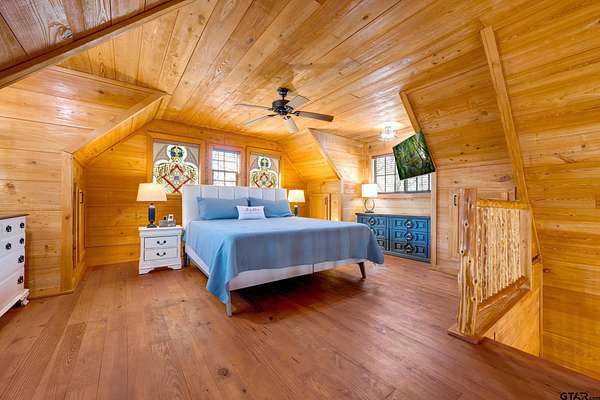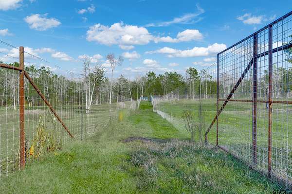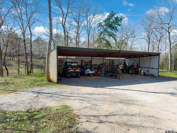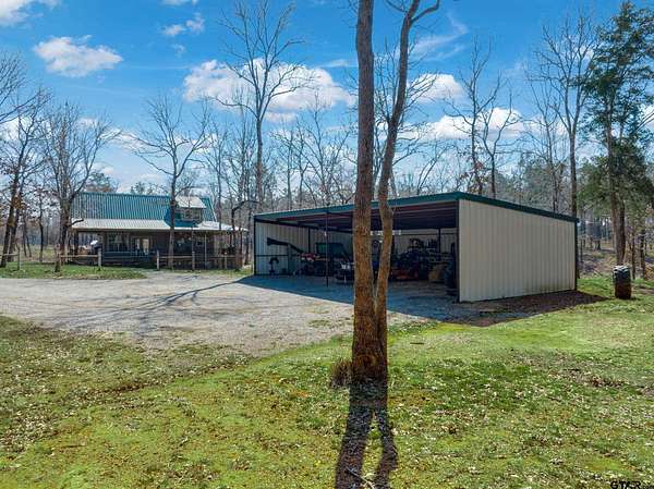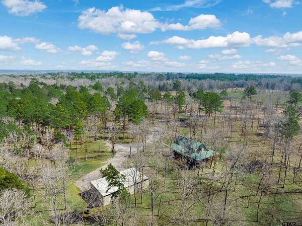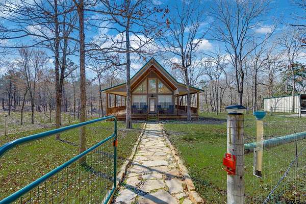 Situated on 106+/- acres, this charming rustic cabin, custom built in 2010, welcomes you via a stone sidewalk and captures picturesque views from its complete wraparound porch. Inside, cedar walls, vaulted ceiling, & stairway plus floor-to-ceiling windows flood the open living, dining, kitchen, pantry, loft bedroom, and bath with natural light. The flooring--reclaimed from a 100-year-old school in Dallas--adds warmth, character, and history to the thoughtfully designed interior. Smart storage solutions maximize space, while the Hardie concrete siding exterior ensures low-maintenance durability. Within the fenced homesite, a cozy firepit creates the perfect setting for cool evenings under the stars. Additional improvements include a 1,500+- sq. ft. metal garage and storage building, plus an 864+- sq. ft. open shed for equipment or recreational vehicles. Approximately 15 acres of high-fence pens (7 total) with a surrounding high-fence alley were previously used for raising deer, offering continued wildlife or livestock opportunities. The land has been enhanced with 130 loads of dirt to prepare for a homesite or barn, providing flexibility for future expansion. Fields have been planted in drought-resistant millet sorghum to sustain wildlife, with established white clover and Bermuda grasses adding to the agricultural appeal. Peach, apple, and fig trees have also been planted for personal enjoyment. Whether you envision a private retreat, recreational ranch, wildlife operation, or future homestead, this remarkable property offers endless possibilities--an extraordinary sanctuary that reflects the restorative beauty and peaceful charm of East Texas living.