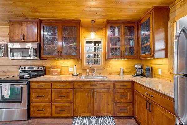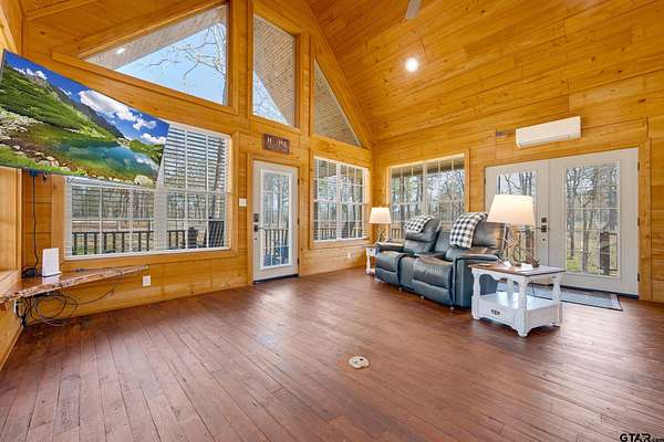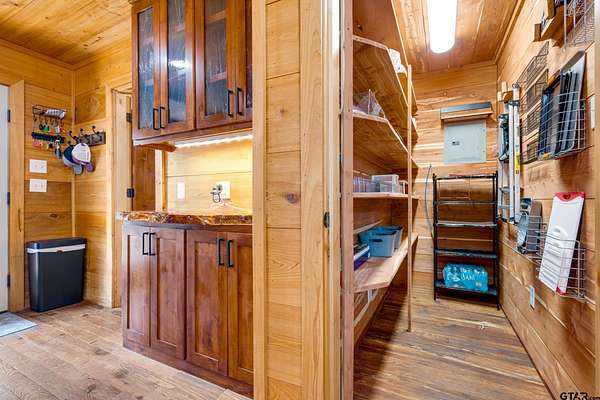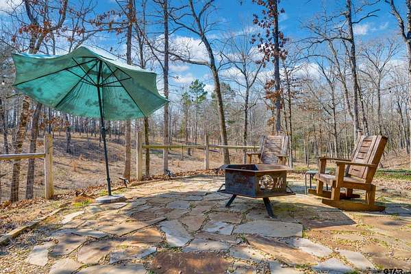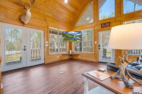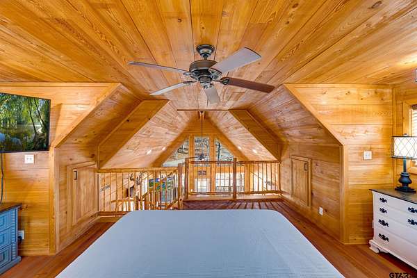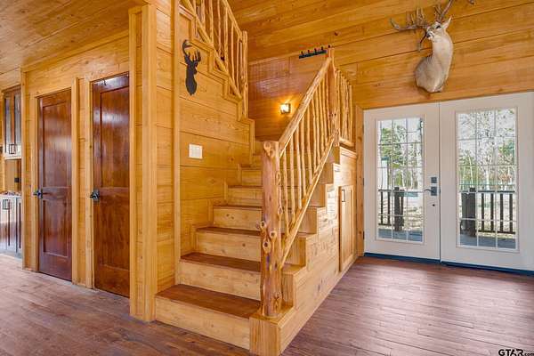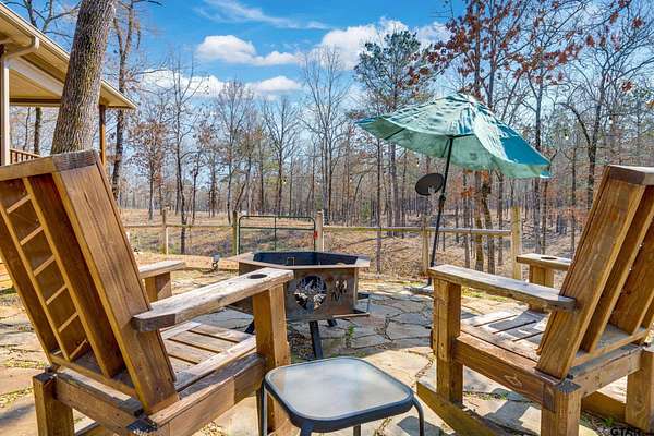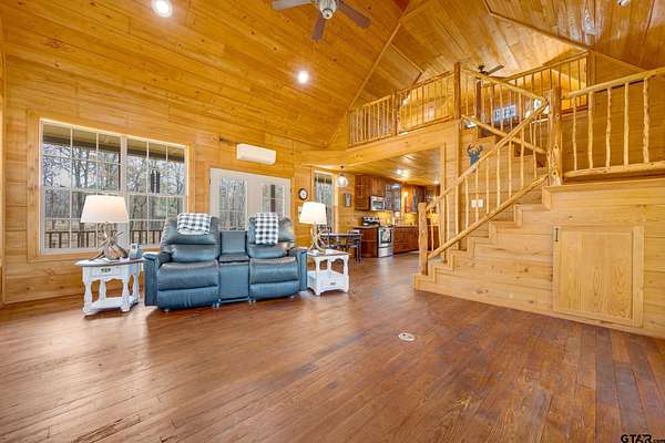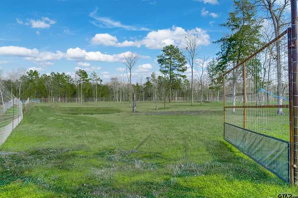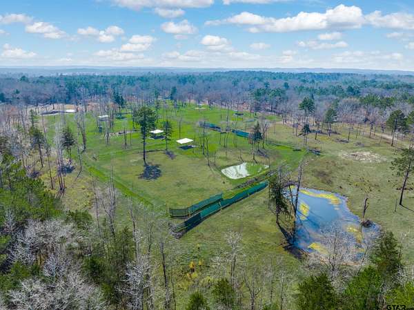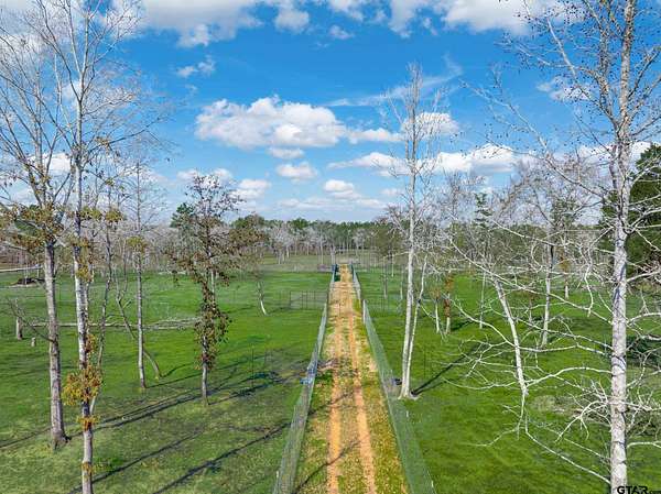 Situated on 106+/- acres, this charming rustic cabin, custom built in 2010, welcomes you via a stone sidewalk and captures picturesque views from its complete wraparound porch. Inside, cedar walls, vaulted ceiling, & stairway plus floor-to-ceiling windows flood the open living, dining, kitchen, pantry, loft bedroom, and bath with natural light. The flooring--reclaimed from a 100-year-old school in Dallas--adds warmth, character, and history to the thoughtfully designed interior. Smart storage solutions maximize space, while the Hardie concrete siding exterior ensures low-maintenance durability. Within the fenced homesite, a cozy firepit creates the perfect setting for cool evenings under the stars. Additional improvements include a 1,500+- sq. ft. metal garage and storage building, plus an 864+- sq. ft. open shed for equipment or recreational vehicles. Approximately 15 acres of high-fence pens (7 total) with a surrounding high-fence alley were previously used for raising deer, offering continued wildlife or livestock opportunities. The land has been enhanced with 130 loads of dirt to prepare for a homesite or barn, providing flexibility for future expansion. Fields have been planted in drought-resistant millet sorghum to sustain wildlife, with established white clover and Bermuda grasses adding to the agricultural appeal. Peach, apple, and fig trees have also been planted for personal enjoyment. Whether you envision a private retreat, recreational ranch, wildlife operation, or future homestead, this remarkable property offers endless possibilities--an extraordinary sanctuary that reflects the restorative beauty and peaceful charm of East Texas living.