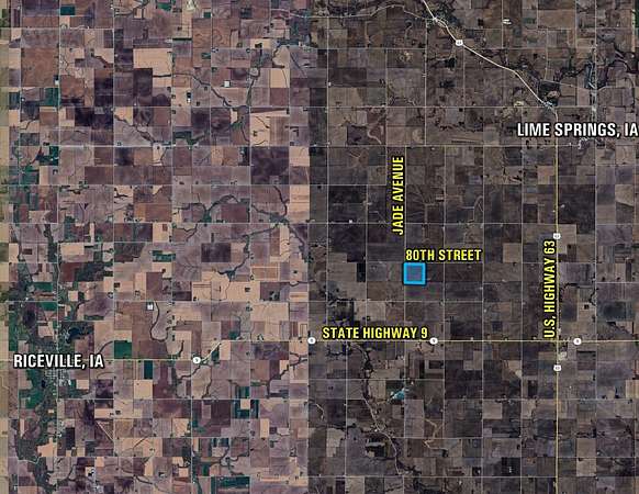 From Saratoga, Iowa: Travel east on Iowa Highway 9 for 1.5 miles until reaching Jade Avenue. Turn left (north) on Jade Avenue for 2 miles, and the property will be located on the right (east) side of the road marked with Company sign.