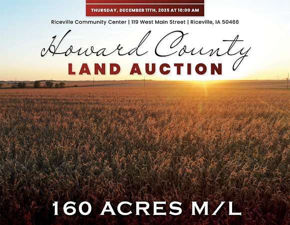 Howard County, Iowa Land Auction - Mark your calendar for Thursday, December 11th, 2025! I'm honored to represent 160 acres m/l located northeast of Saratoga, Iowa. The farmland will be offered via Public Auction as one tract and will take place at 10:00 AM at the Riceville Community Center. The farm consists of 118.30 FSA cropland acres, including 93.60 acres currently in row crop production with a CSR2 rating of 69.6. The primary soil types are Protivin loam, Riceville loam, and Clyde silty clay loam. The balance of the FSA cropland acres includes 24.70 acres enrolled in CRP (Conservation Reserve Program). The CRP contracts include: 1.60 acres enrolled in CP8A through 2026, generating $570 annually ($356.33/acre) 17.80 acres enrolled in CP21 through 2030, generating $3,418 annually ($192/acre) 5.30 acres enrolled in CP27&28 through 2030, generating $1,018 annually ($192/acre) Together, these contracts yield a total annual income of $5,006. Farmland acres are designated as NHEL (Non-Highly Erodible Land), and private drainage tile has been installed. The tract has great access to Iowa Highway 9 with several competing grain marketing options nearby. The farm lease has been terminated and will be open for the 2026 growing season. The property is situated in Section 15 of Saratoga Township, Howard County, Iowa. Visit our website for more information regarding this Auction!