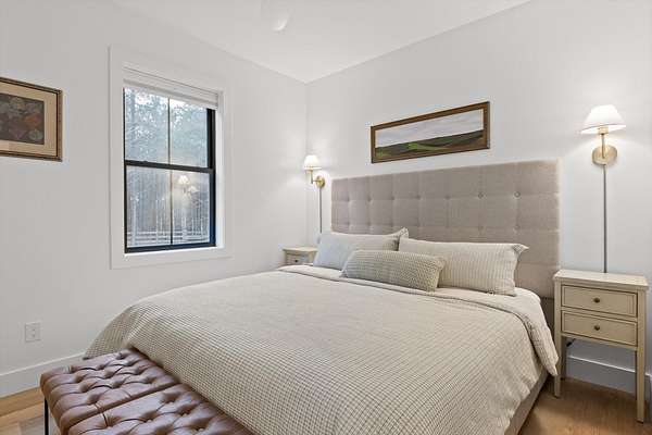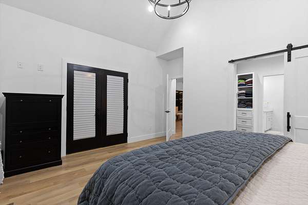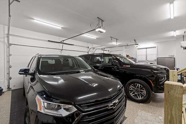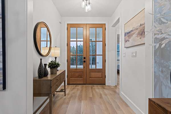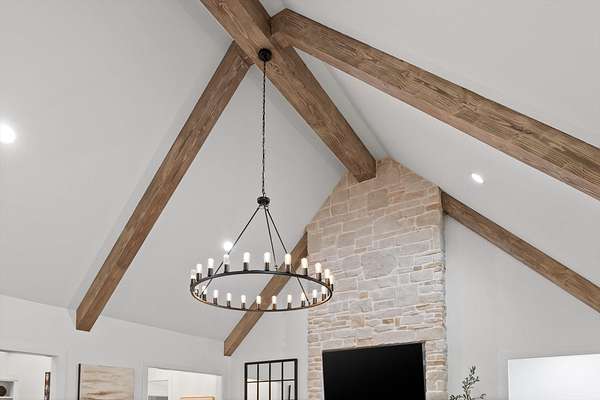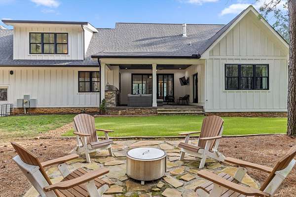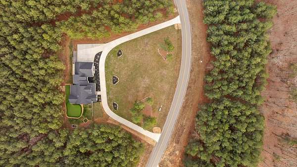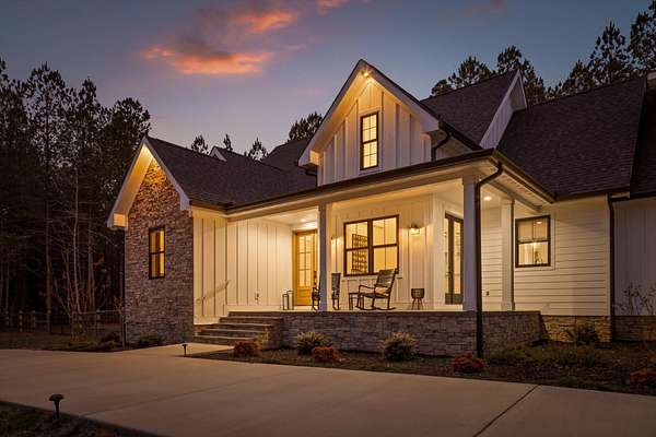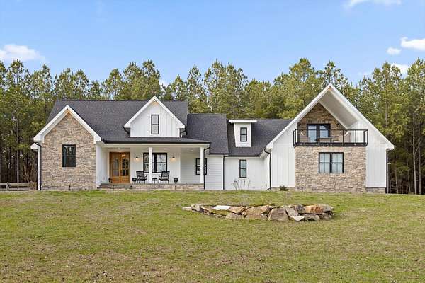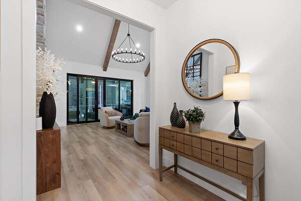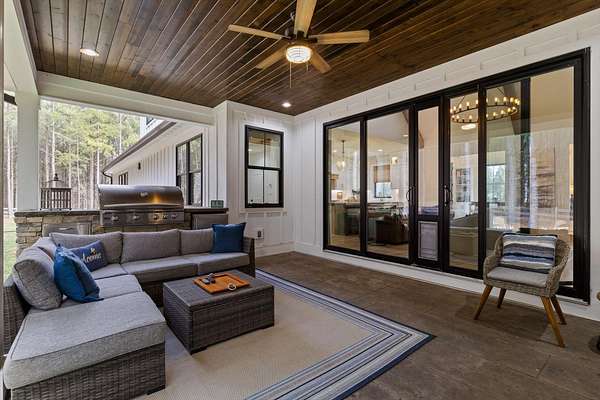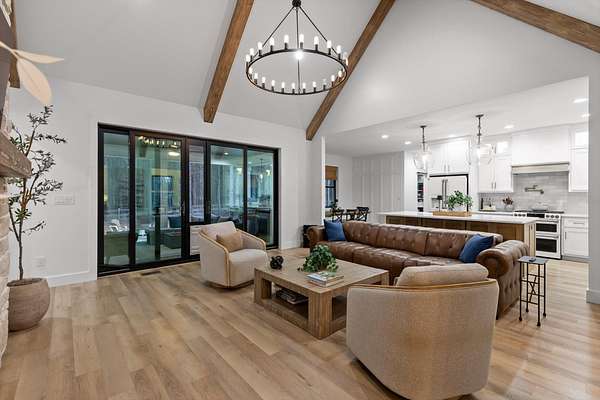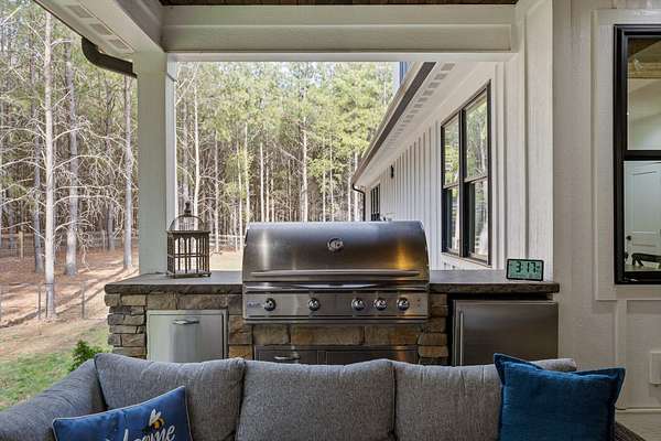 Nestled in a tranquil wooded setting with open sky above, this like-new 2023 residence blends modern craftsmanship with everyday functionality, offering a seamless balance of style, comfort, and thoughtful design. A private driveway leads to a serene retreat where natural surroundings offer a true sense of peace and serenity. The covered front porch welcomes you into a light-filled foyer that opens to an expansive vaulted living room anchored by a striking stone fireplace. Patio doors frame the landscape and lead to a covered back deck with stone grilling built-ins, outdoor refrigerator, and wood-accent ceiling, extending the living area for effortless indoor-outdoor entertaining.